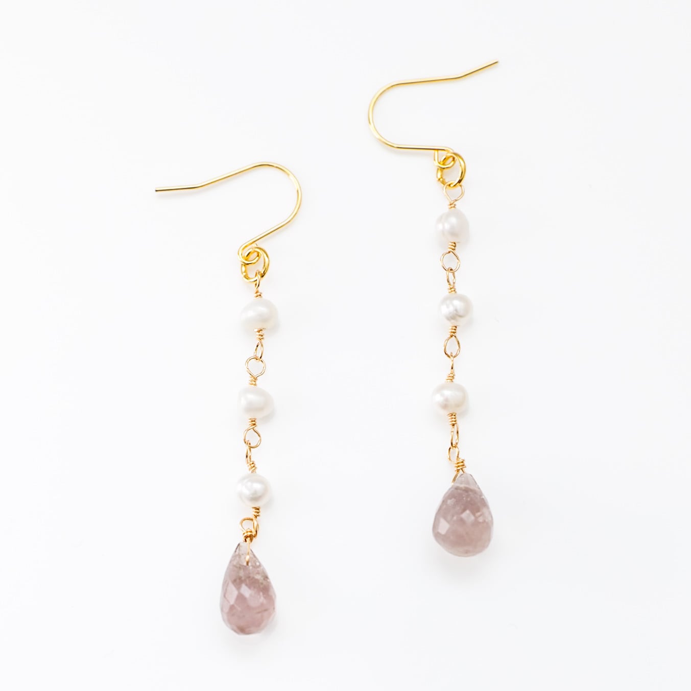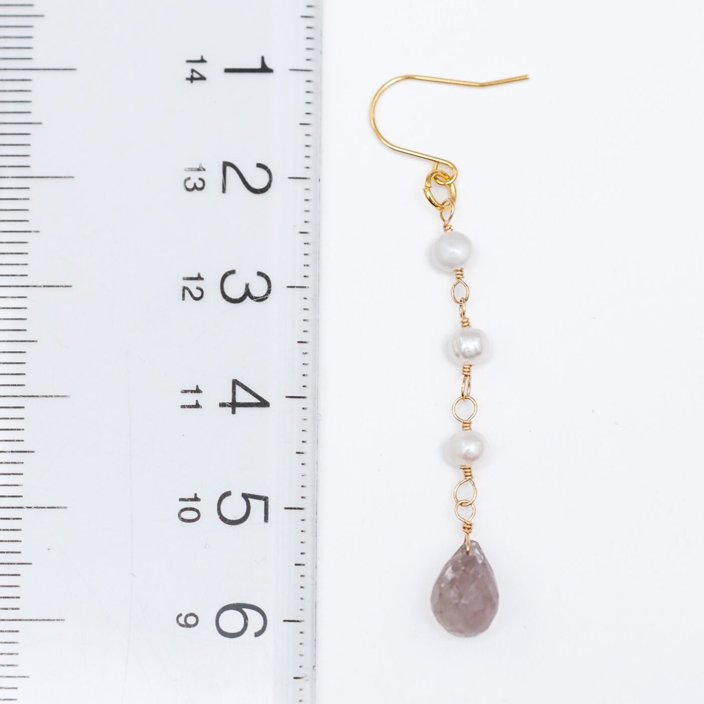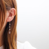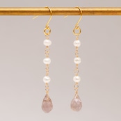 淡く優しい色合いのフローライトと、小粒で上品な艶のある淡水パールを繋いだ、シンプルで軽やかな縦ラインのピアスです。