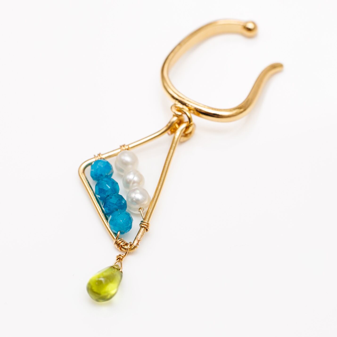 透明感のある淡水パール、鮮やかなブルーのアパタイト、そして瑞々しいグリーンのペリドットを組み合わせた三角モチーフイヤーカフです。