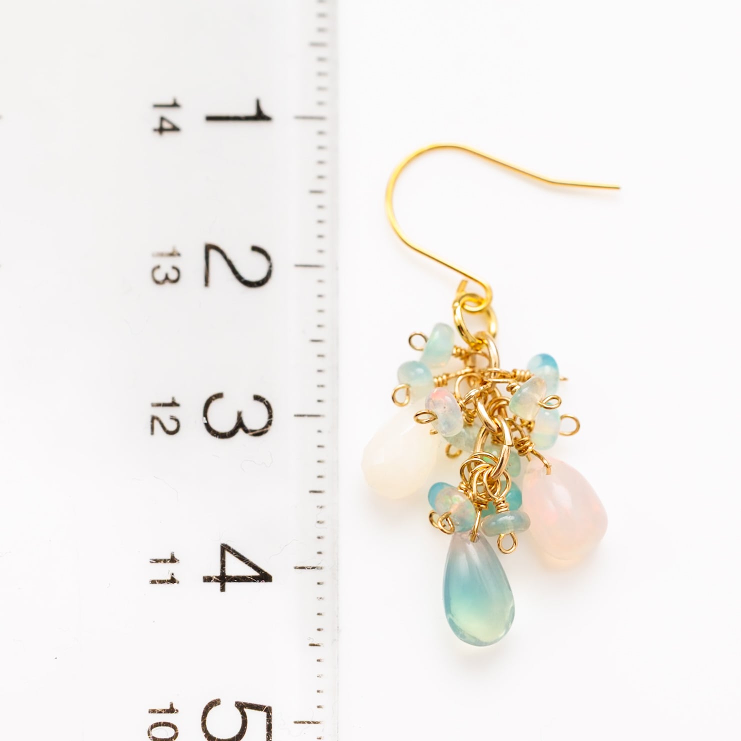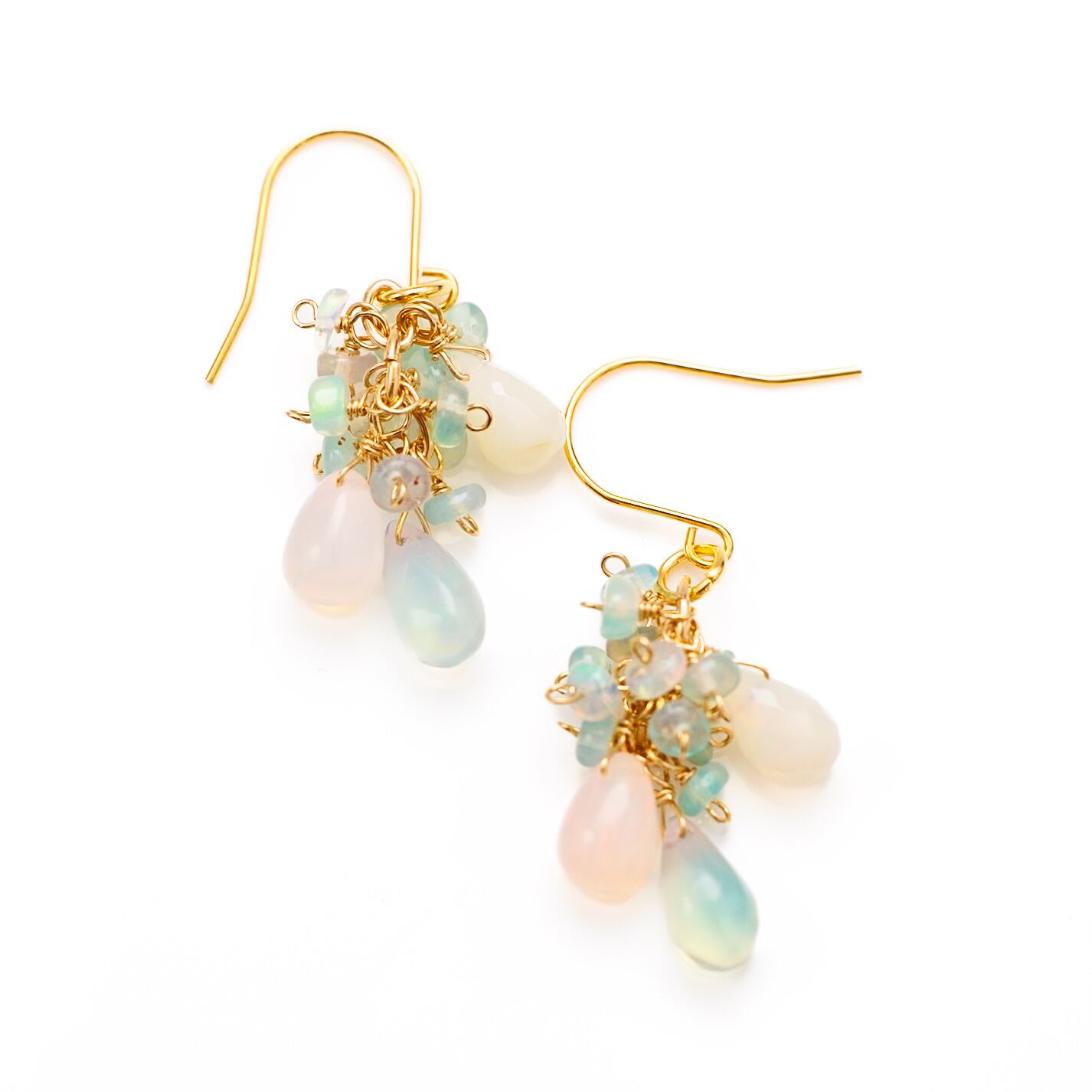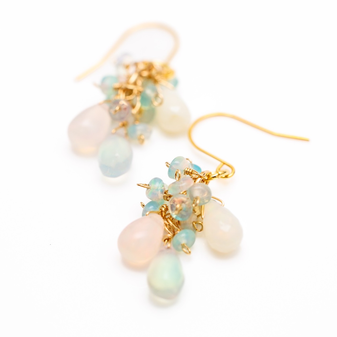 小粒のオパールを丁寧にワイヤーで束ね、揺れるたびにやわらかく光を放ちます。