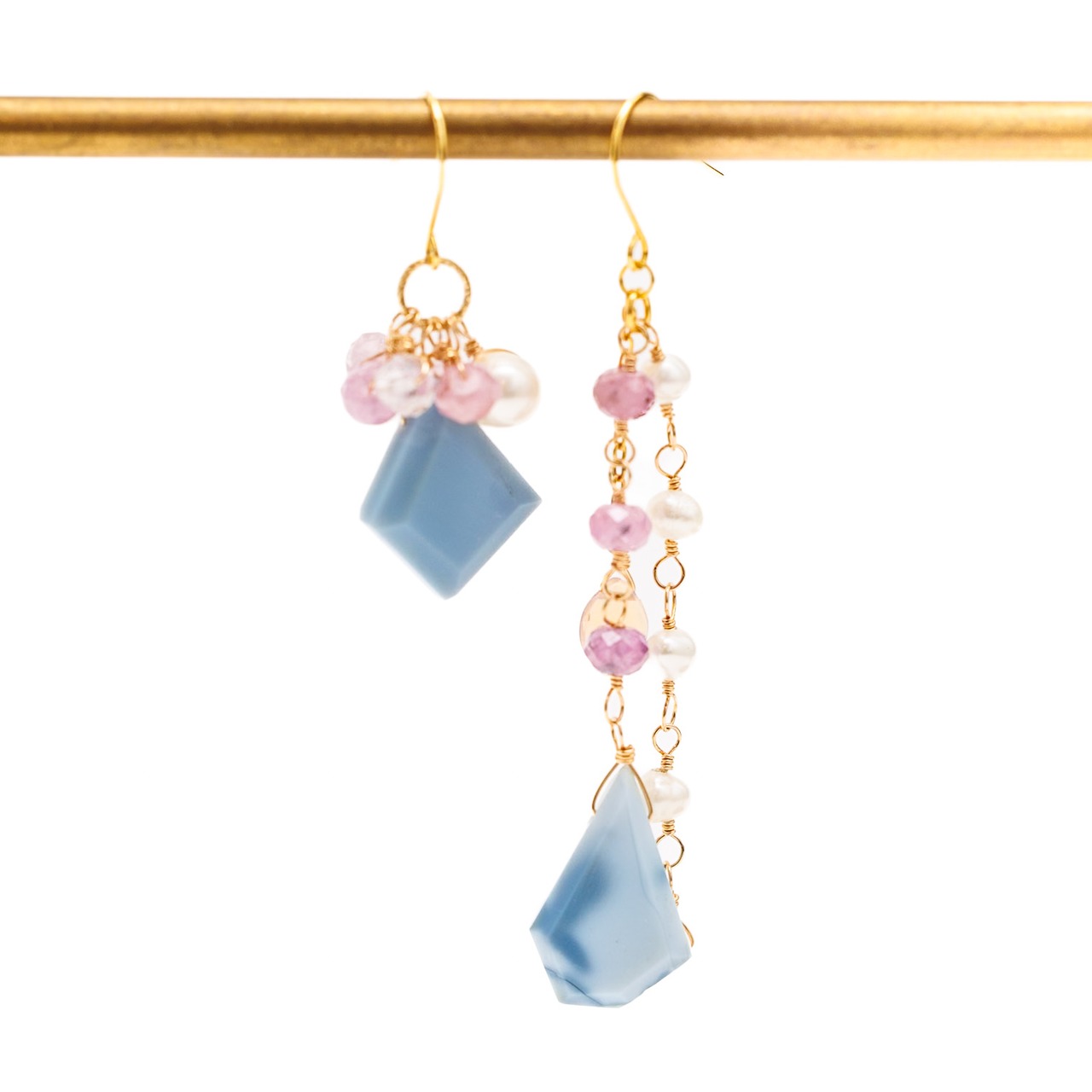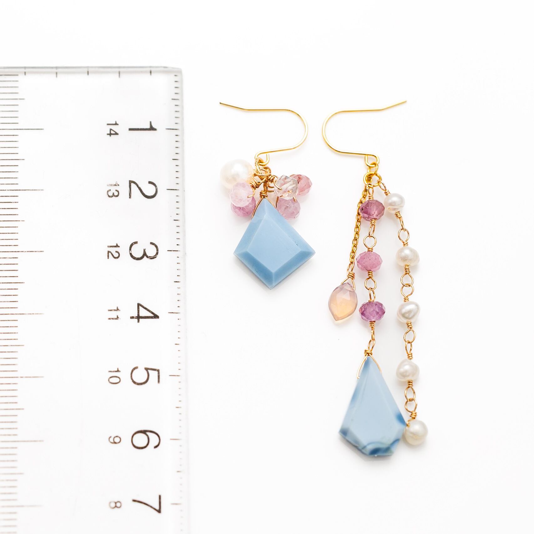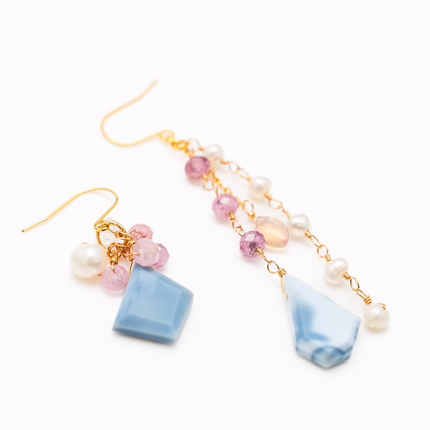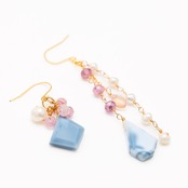 ブルーオパール、ピンクサファイア、淡水パール、パーキマーダイヤモンド、ピンクオパールを贅沢に組み合わせた、アシンメトリーなデザインの天然石ピアスです。