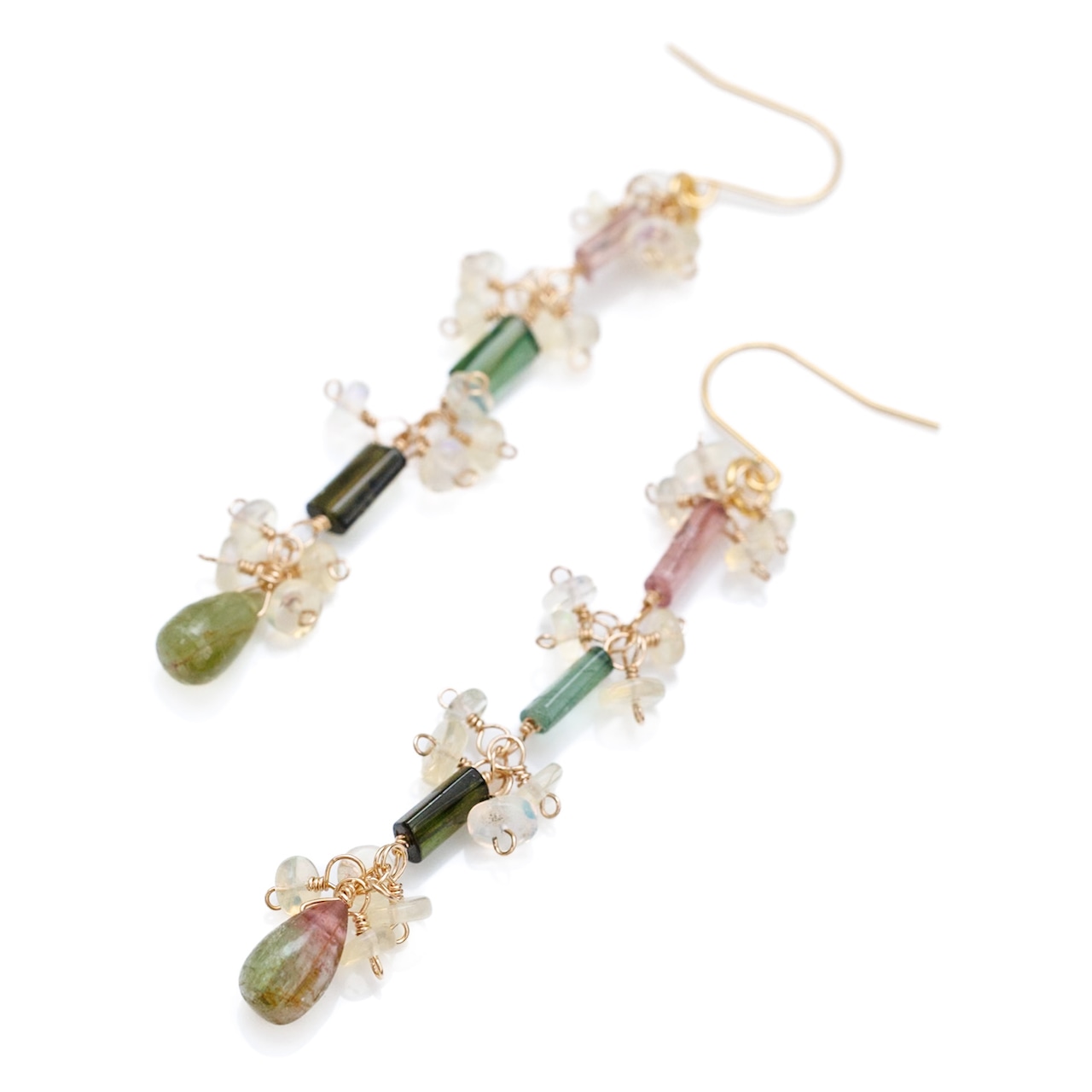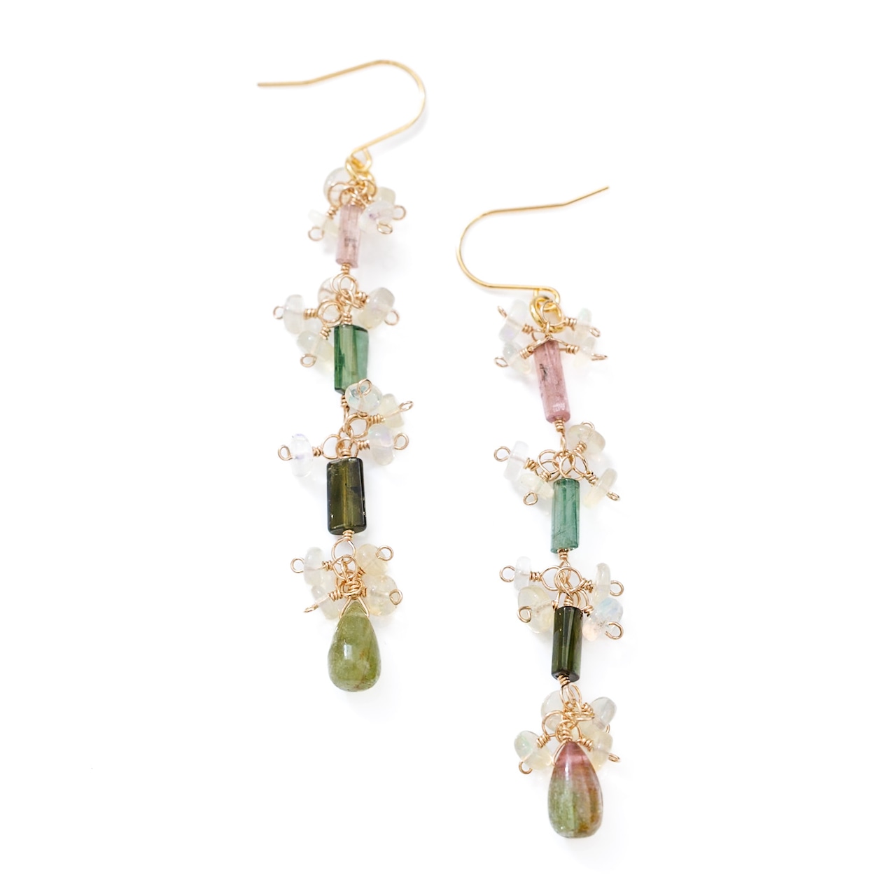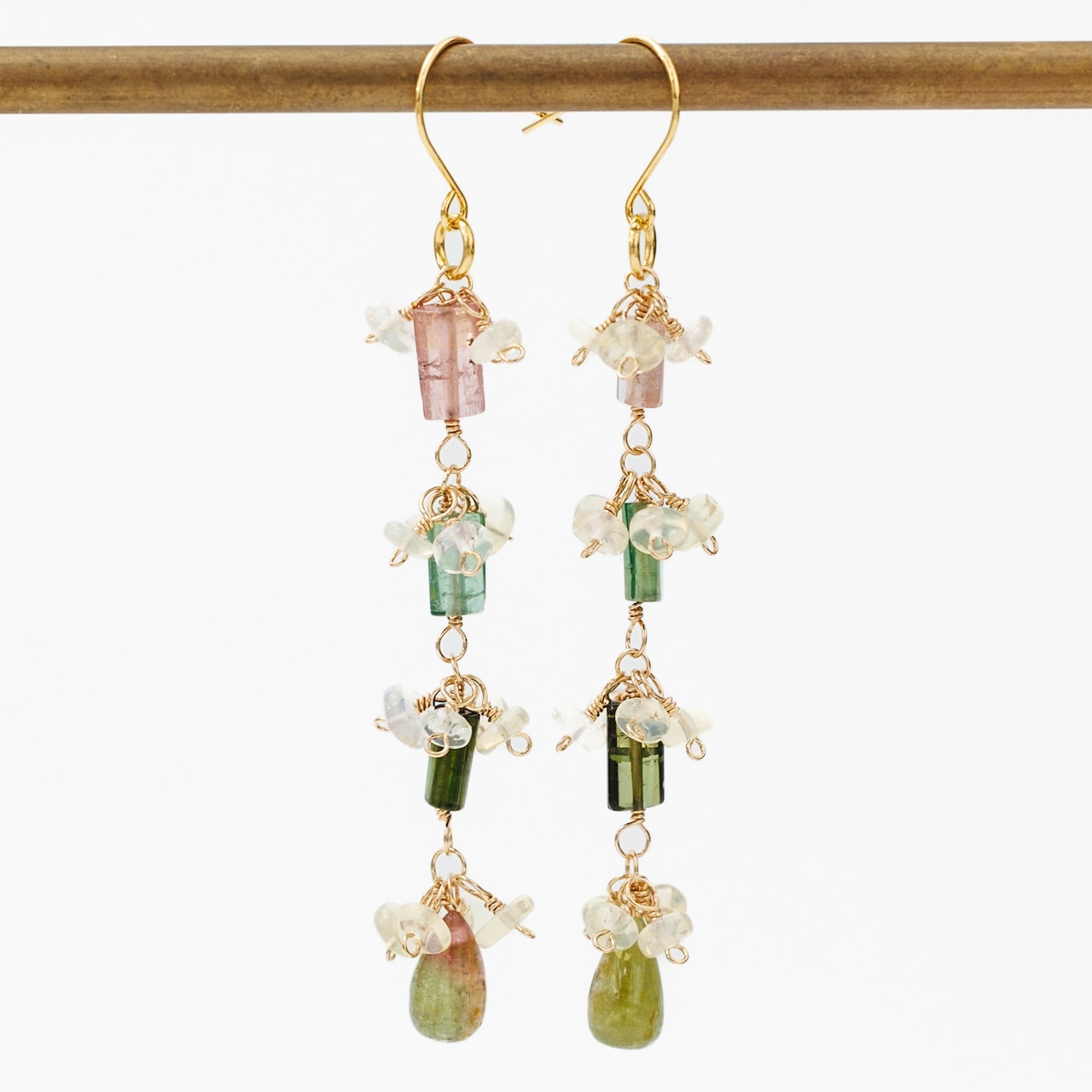 10月の誕生石であるトルマリンとオパールを組み合わせた、華やかなロングピアスです。