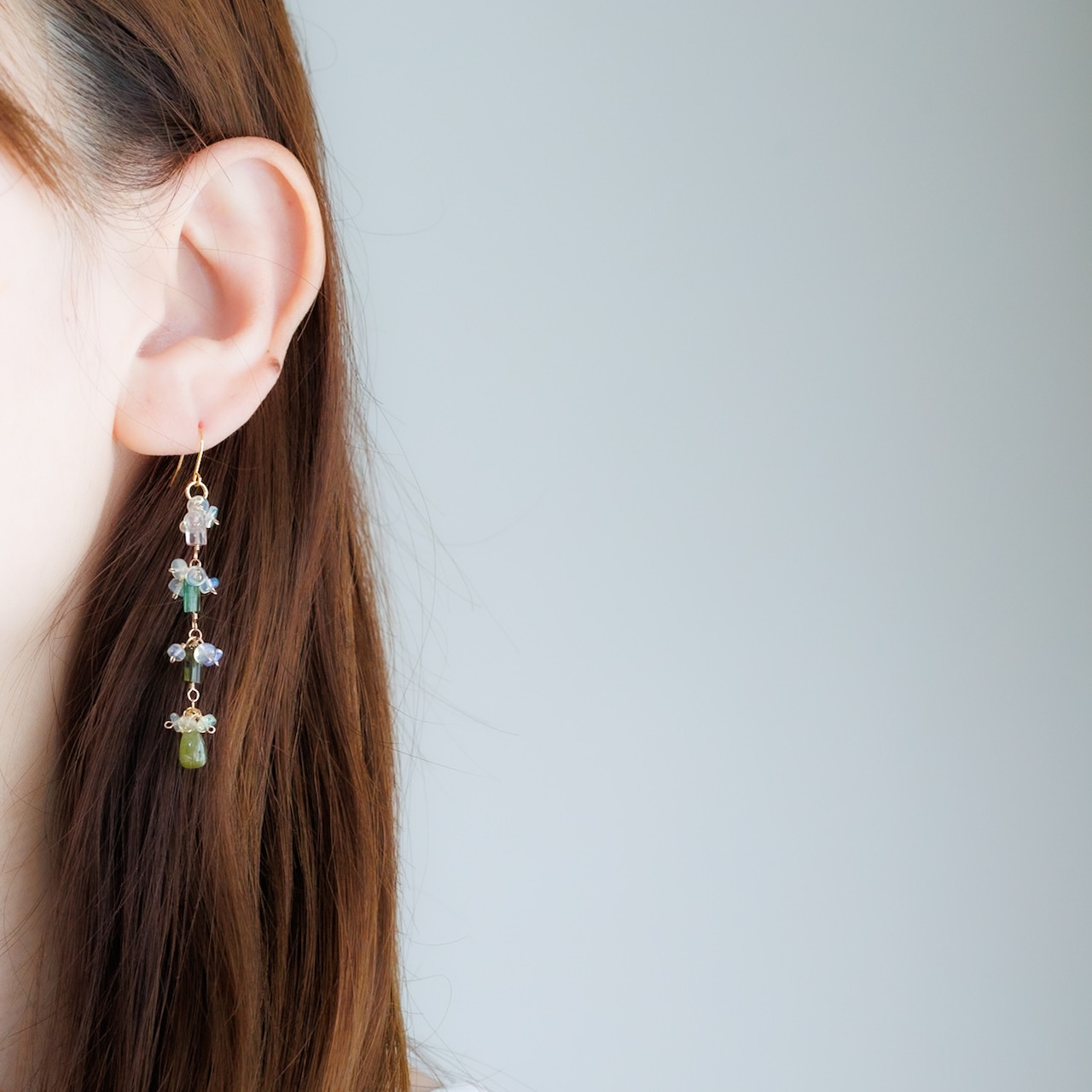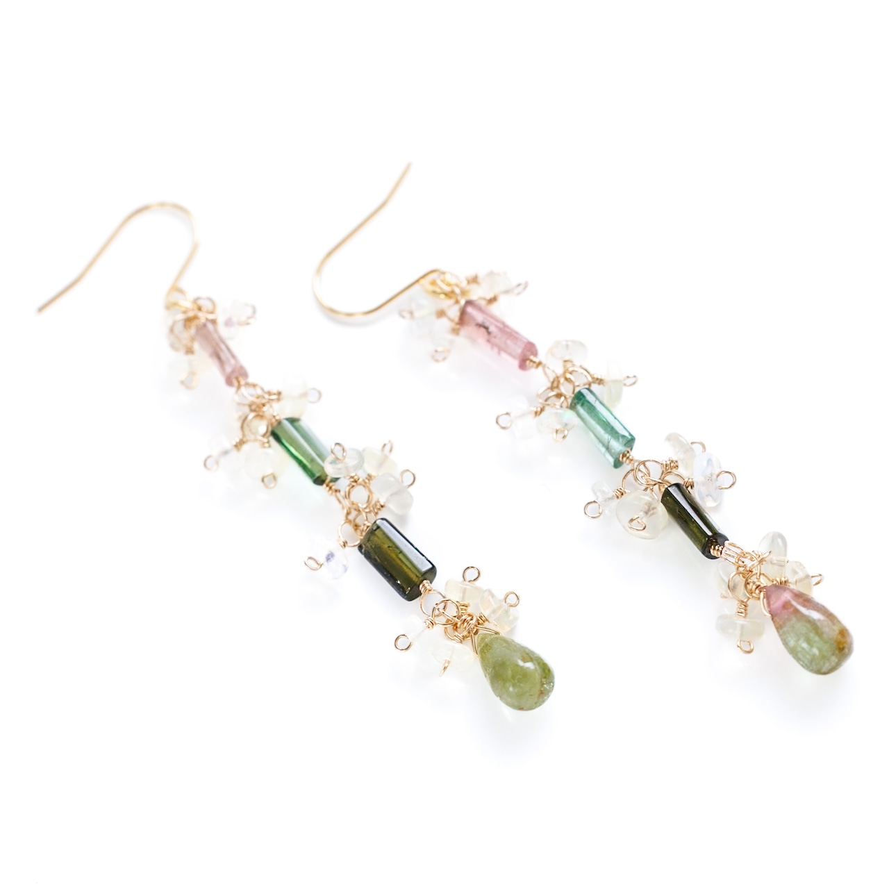 ピンク、淡いグリーン、深いグリーンと色合いの異なるトルマリンを組み合わせ、さらに下部のドロップ型トルマリンはバイカラーのものもあり、耳元で揺れるたびに表情を変えます。