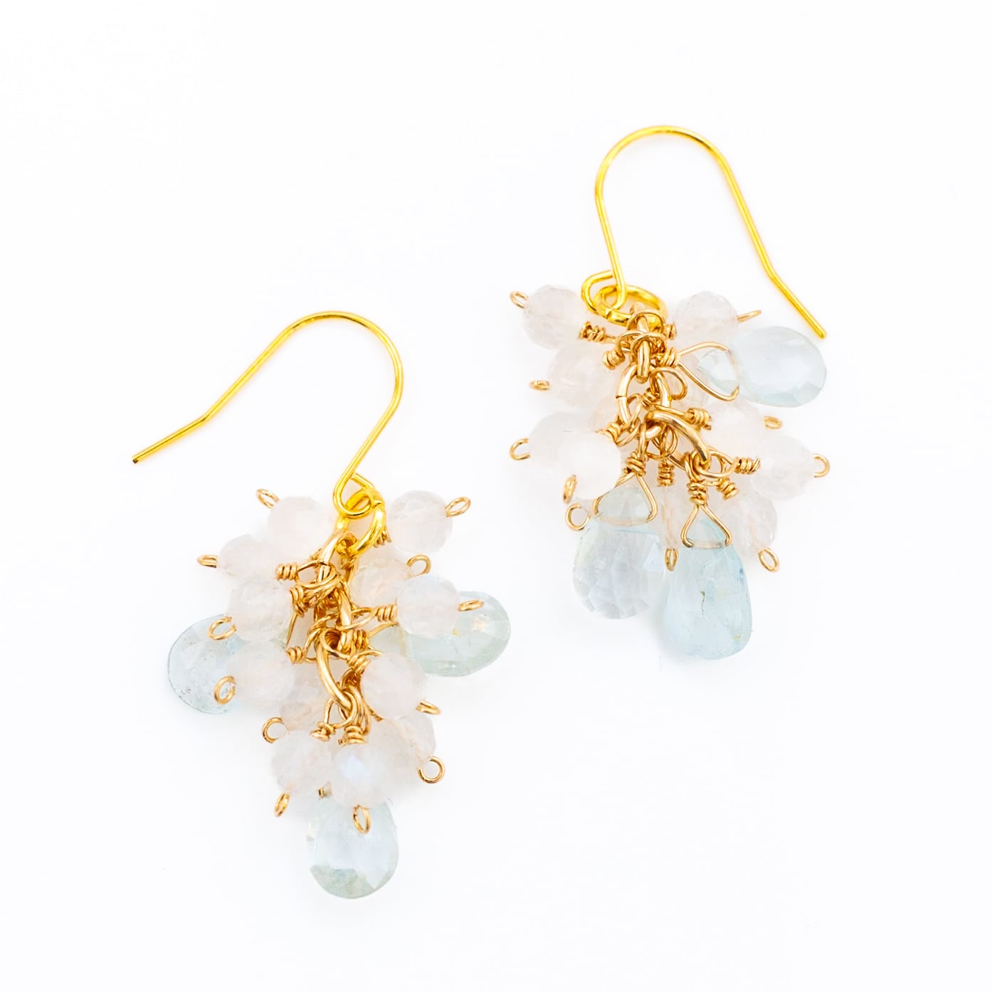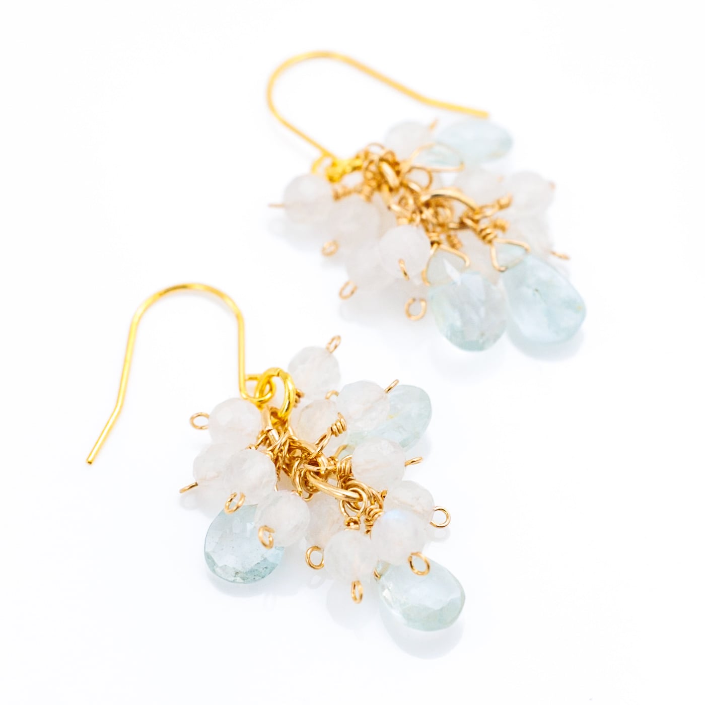 やわらかなブルーが印象的なアクアマリンと、白の中にほんのりと虹色の光を映すレインボームーンストーンを組み合わせた耳飾りです。