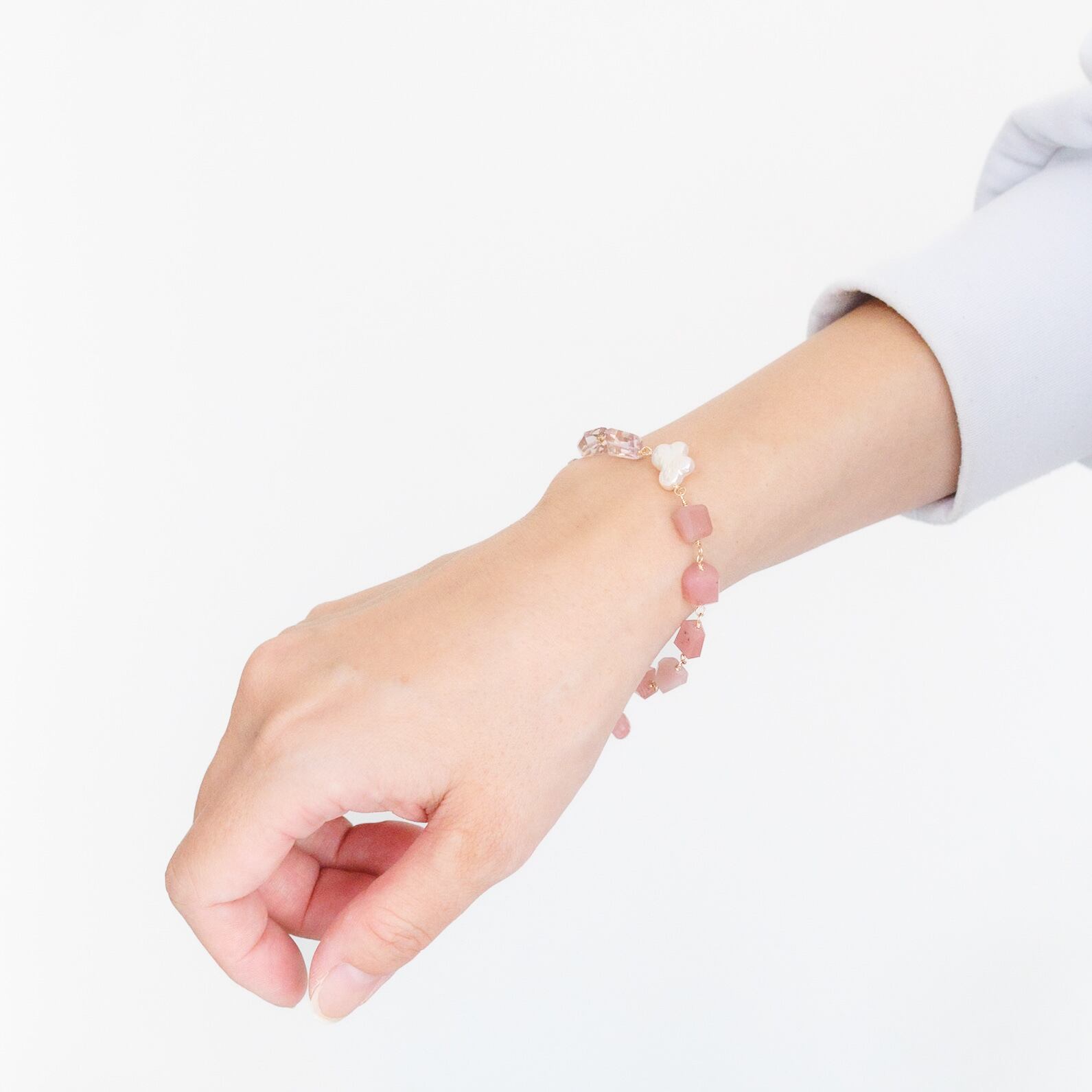 ひと粒ひと粒異なる天然石の表情がやさしく手元にきらめき、色合いが上品な印象を与えます。