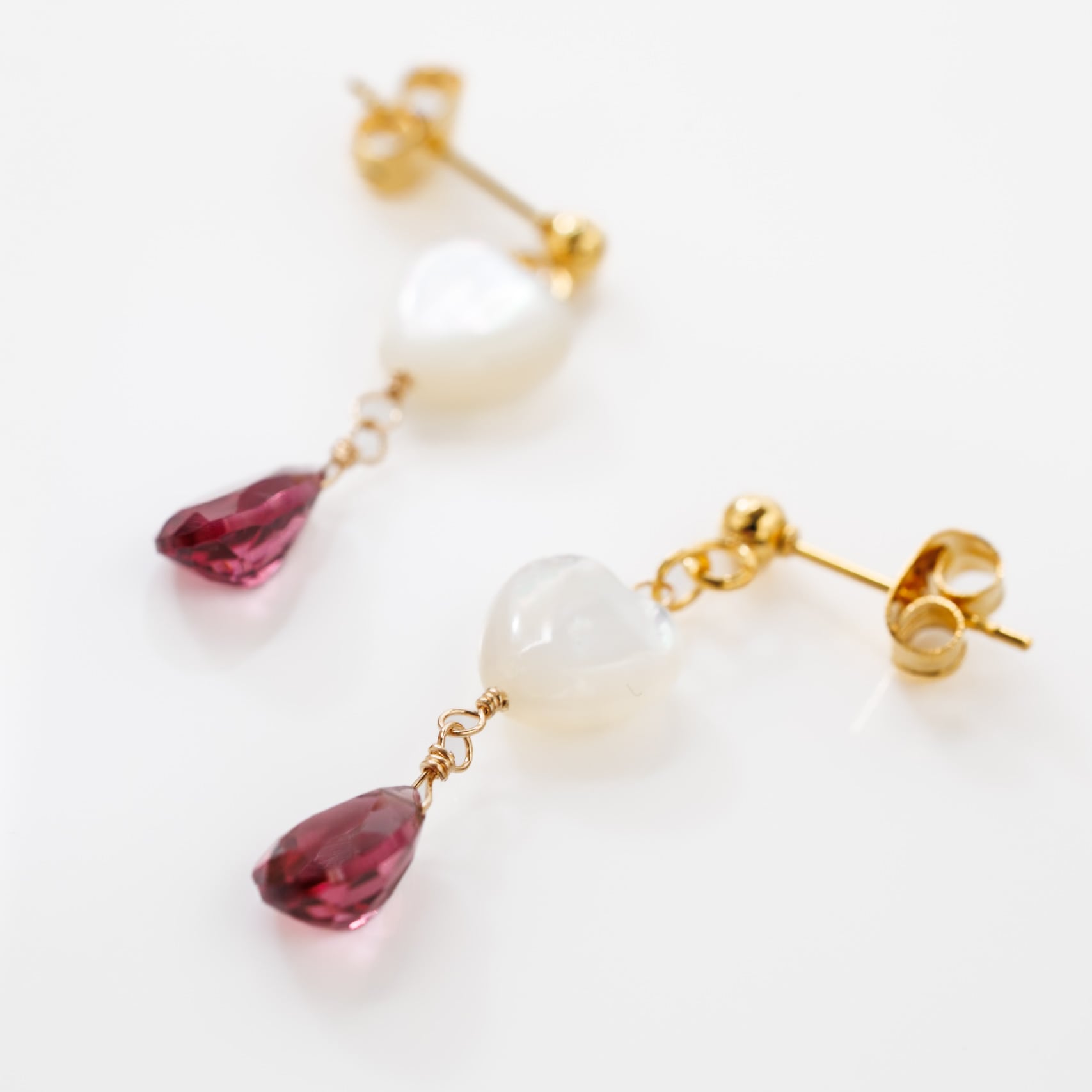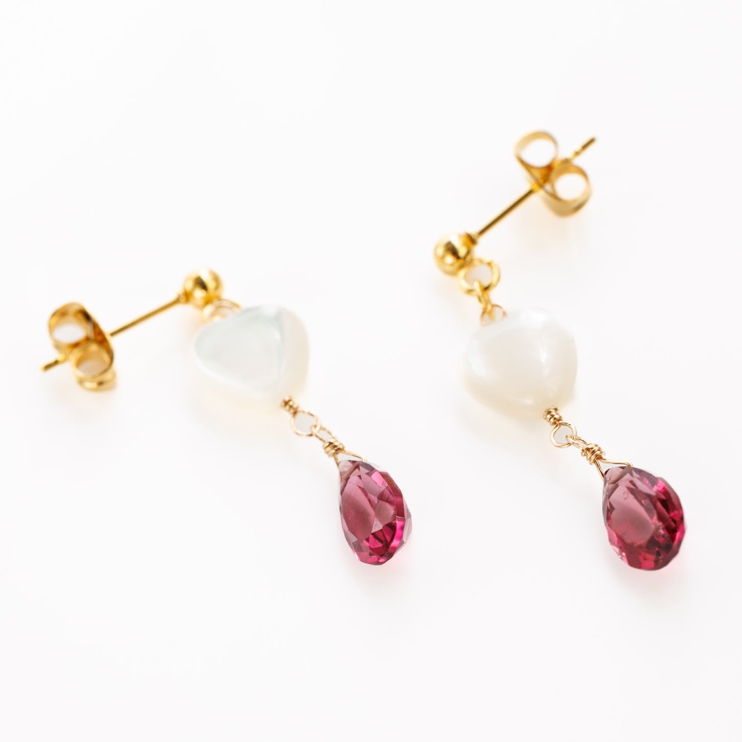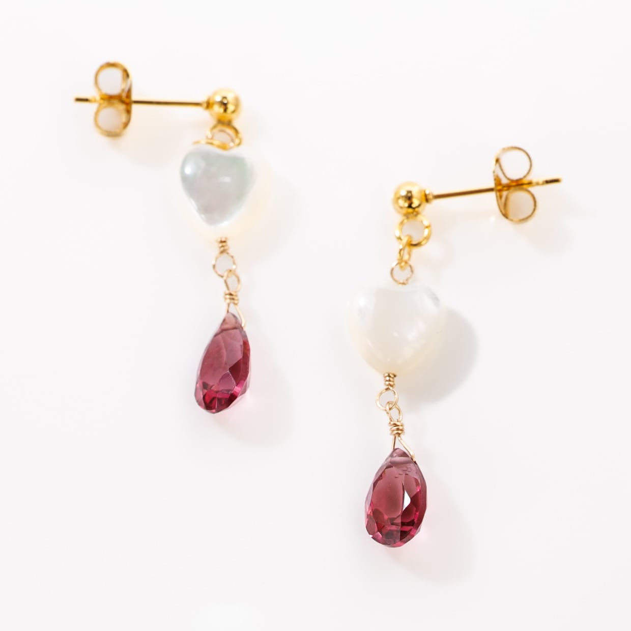 ハートのマザーオブパールとロードライトガーネットのピアス コンケーブカット
