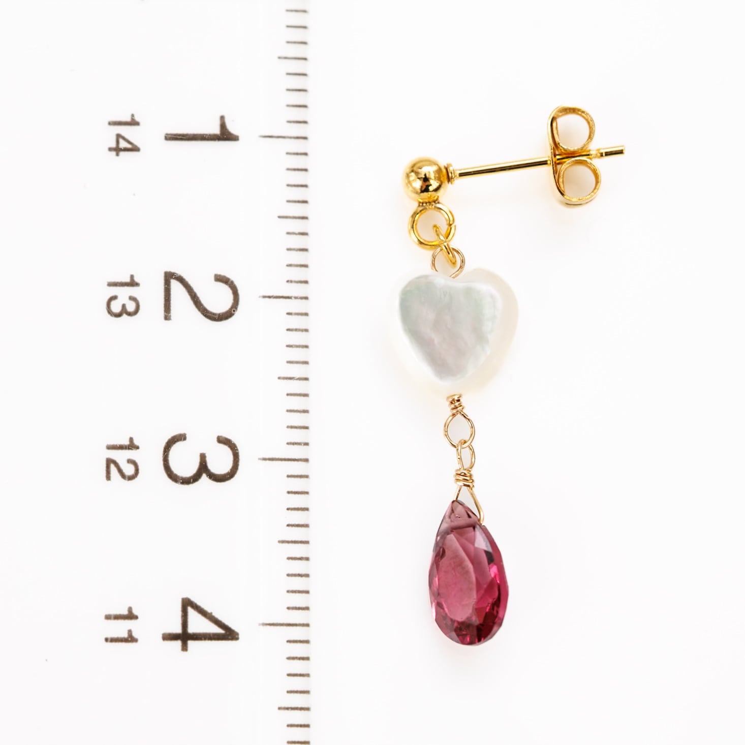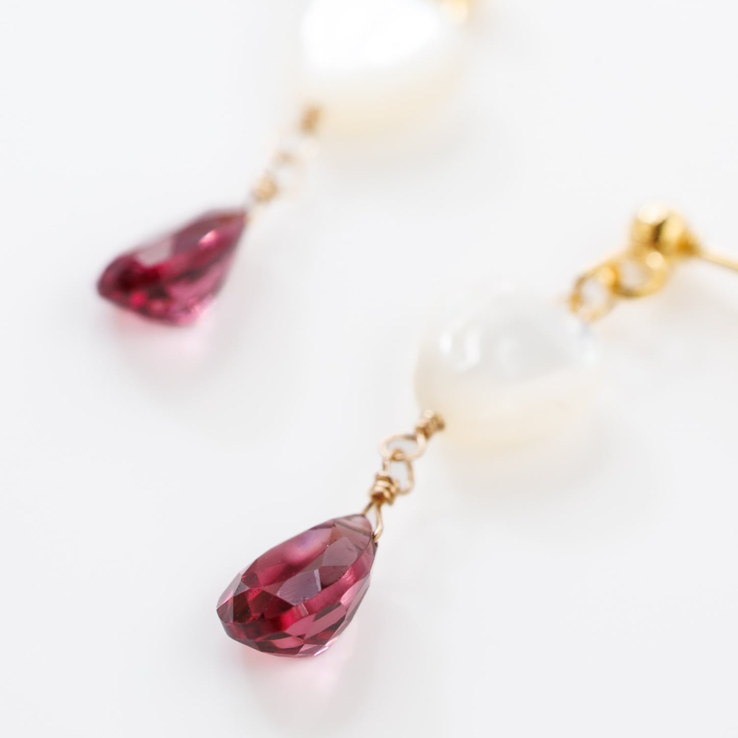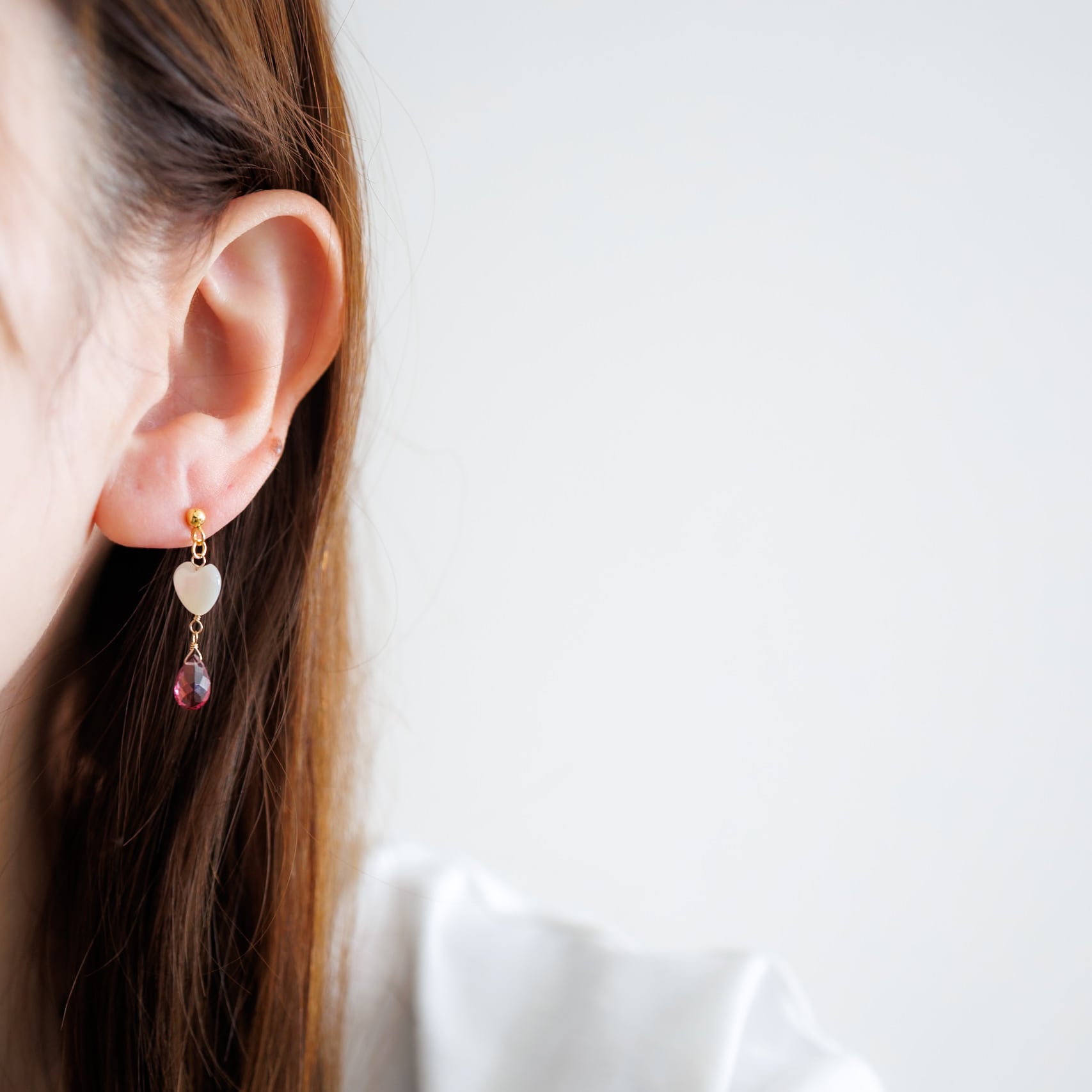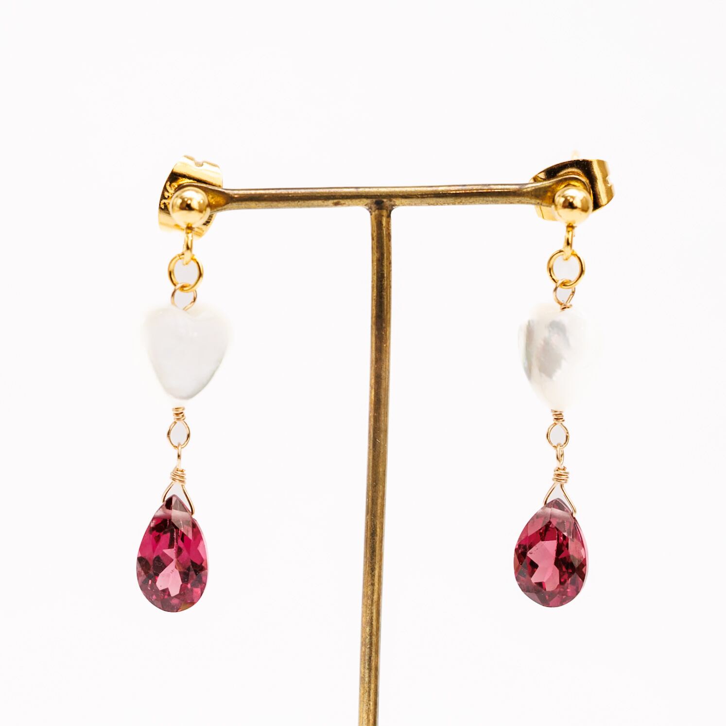 ハートのマザーオブパールとロードライトガーネットのピアス コンケーブカット