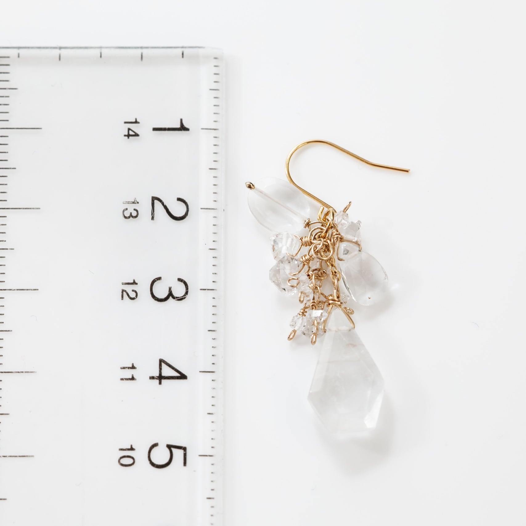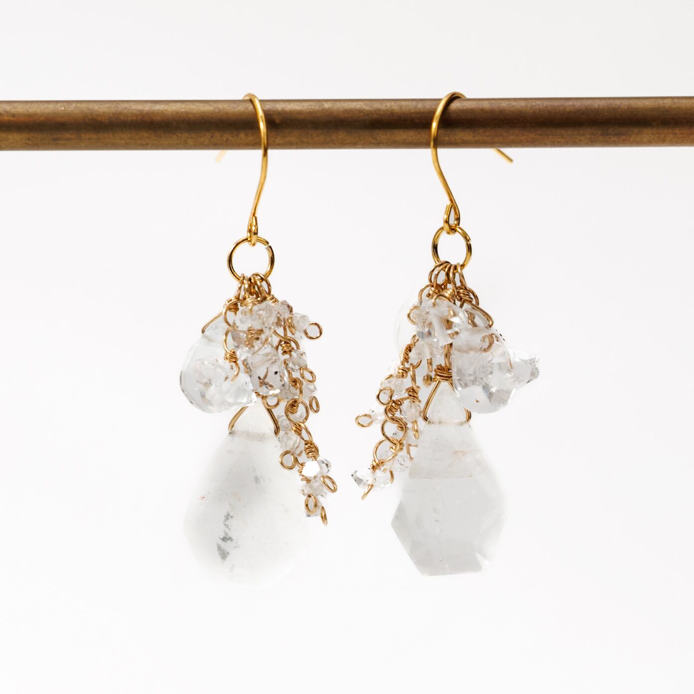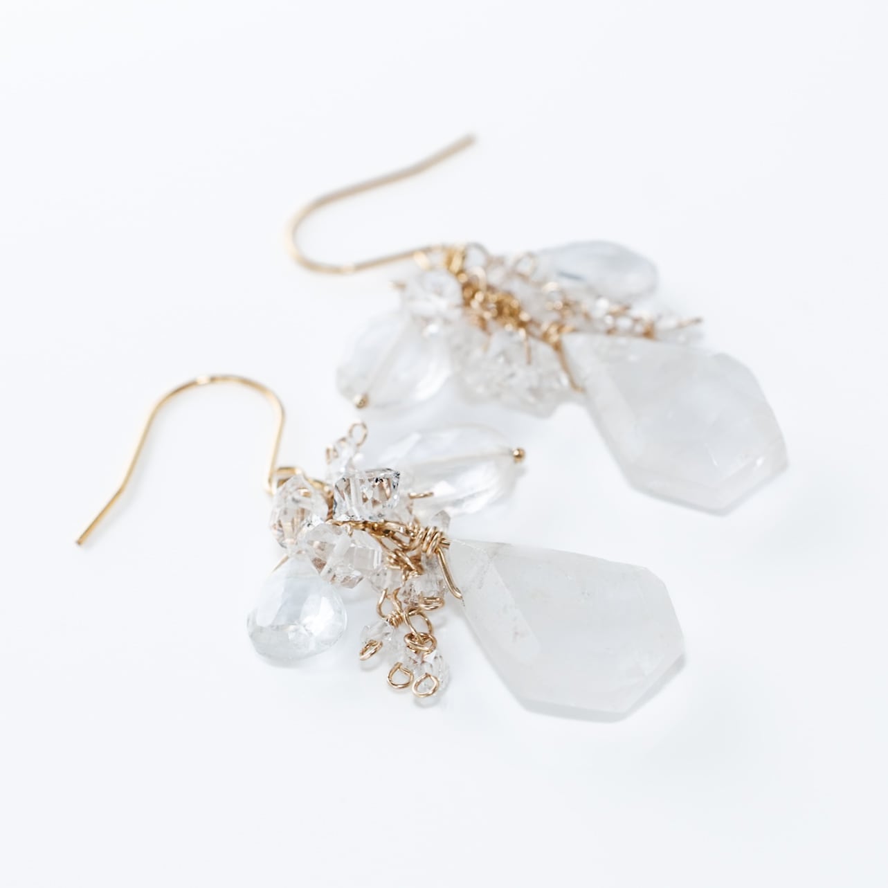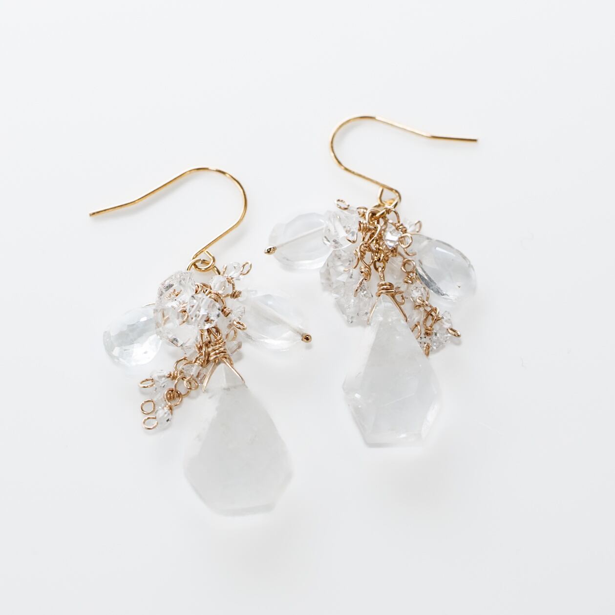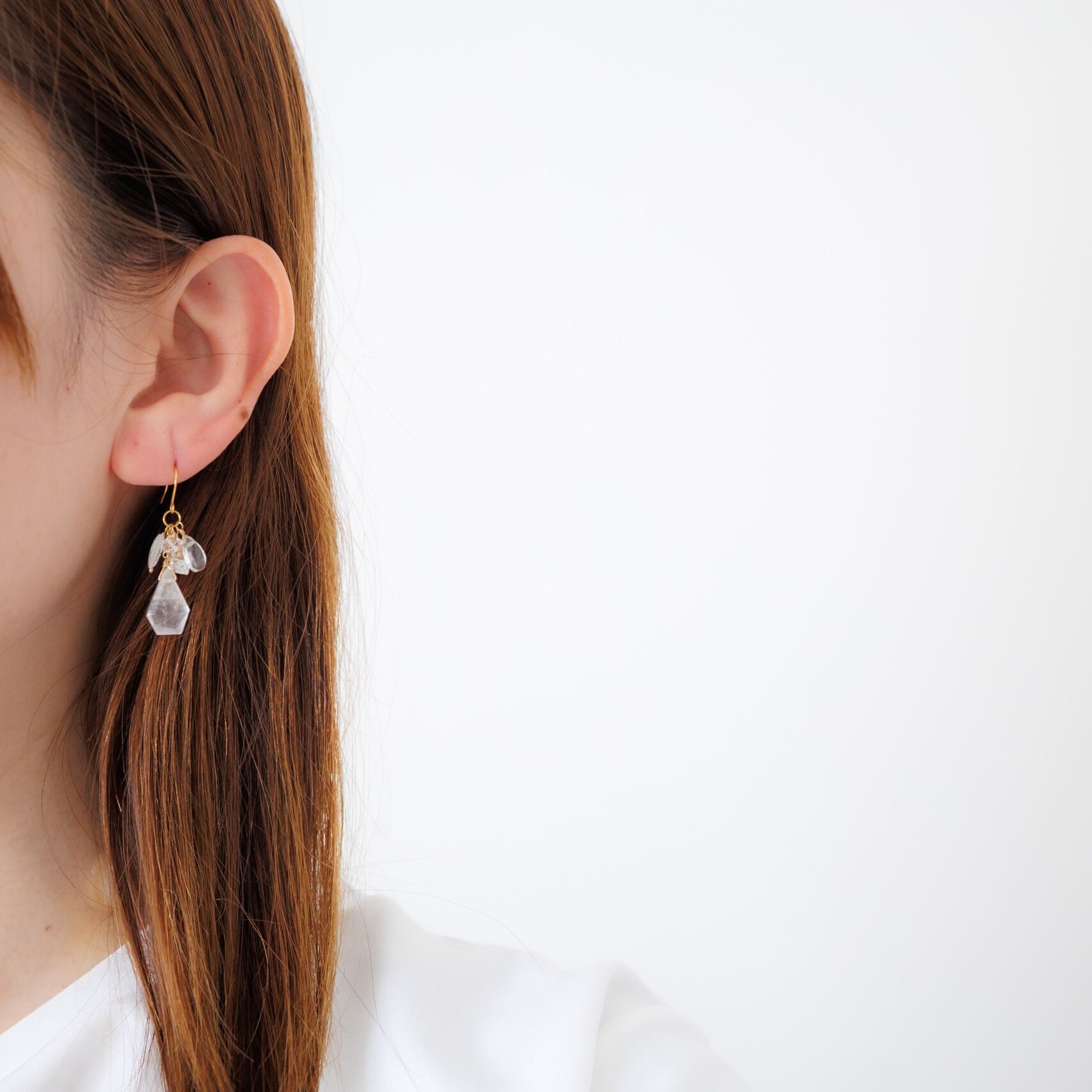 すべて水晶だけを使い、透明感の中にそれぞれ異なる表情を重ねた耳飾りを仕立てました。