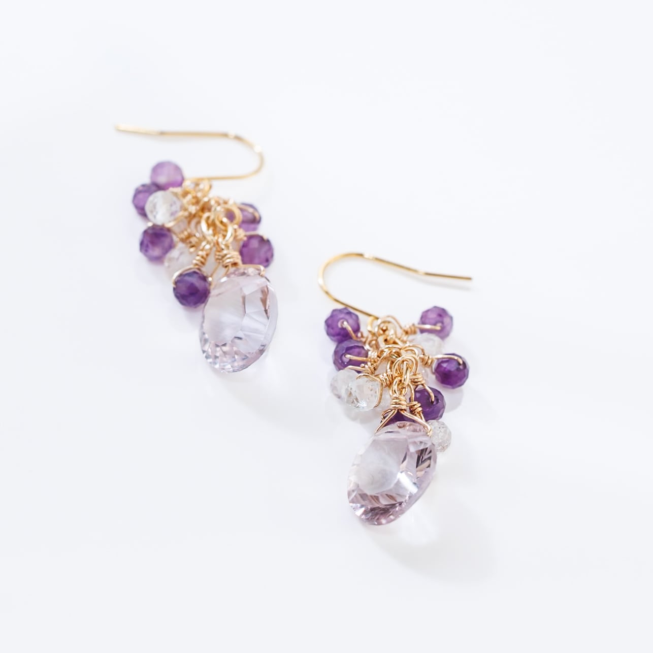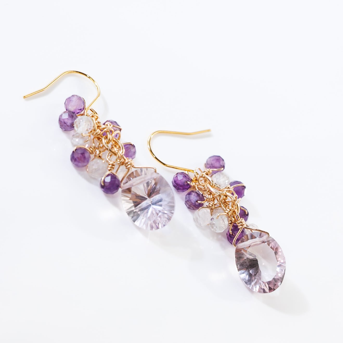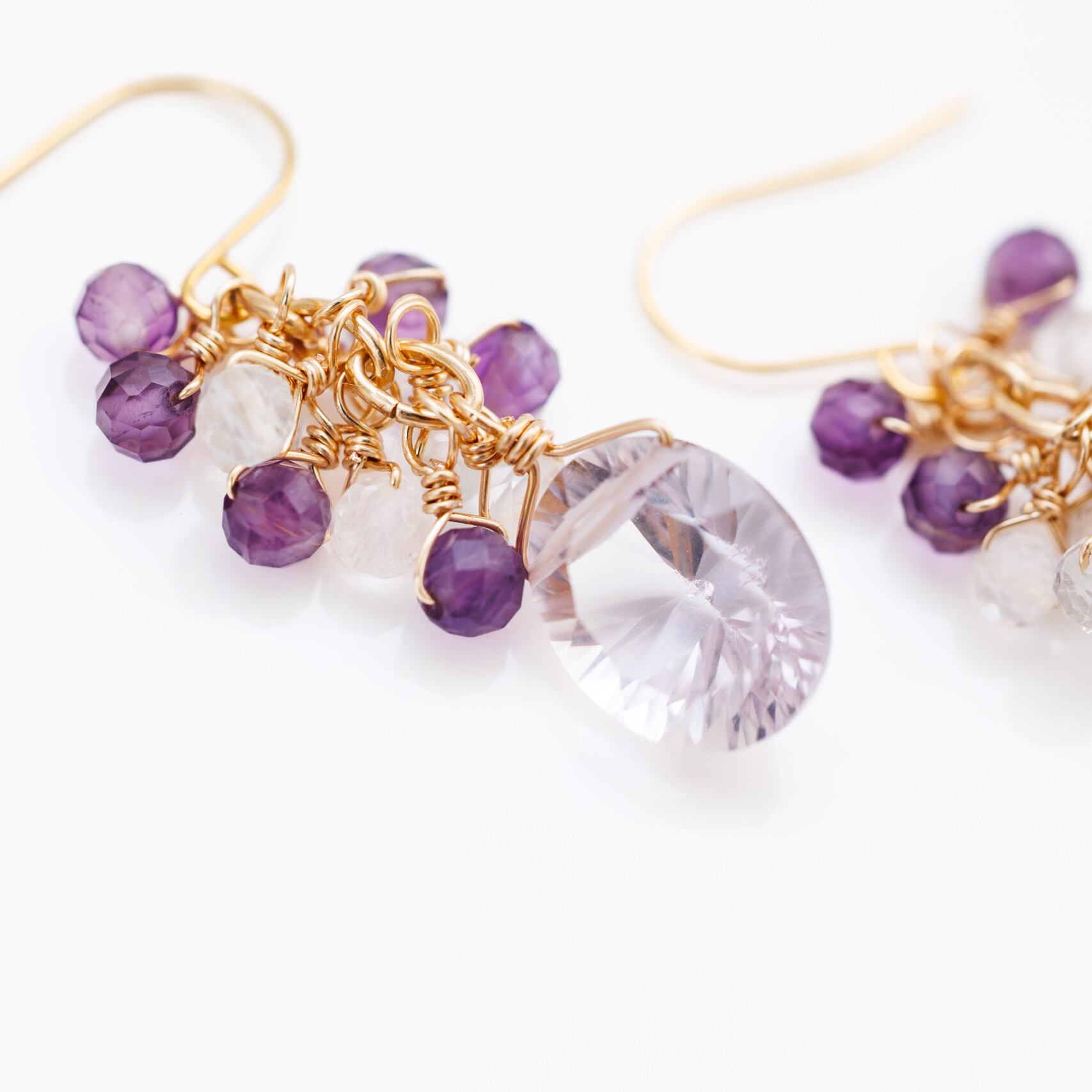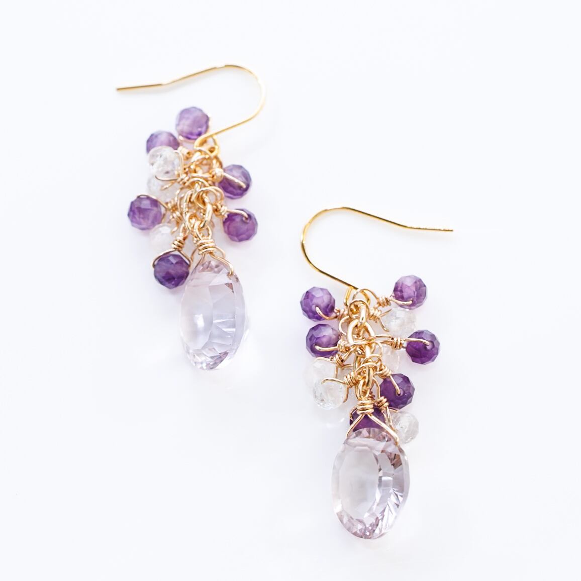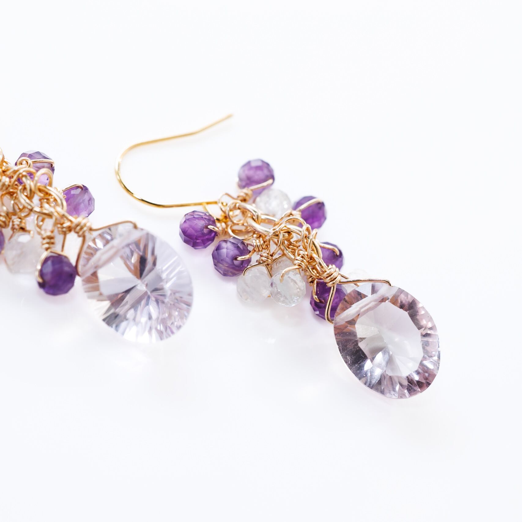 コンケーブカットのラベンダーアメシストを主役に、アメシストとホワイトトパーズの小粒をしゃらしゃらと添えたピアスです。