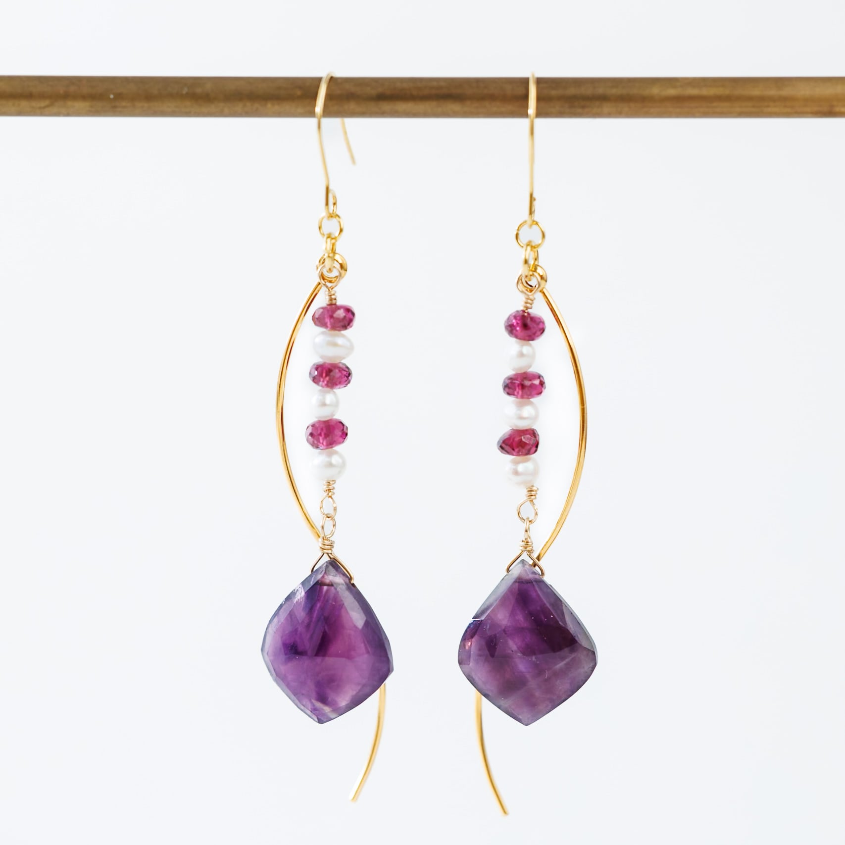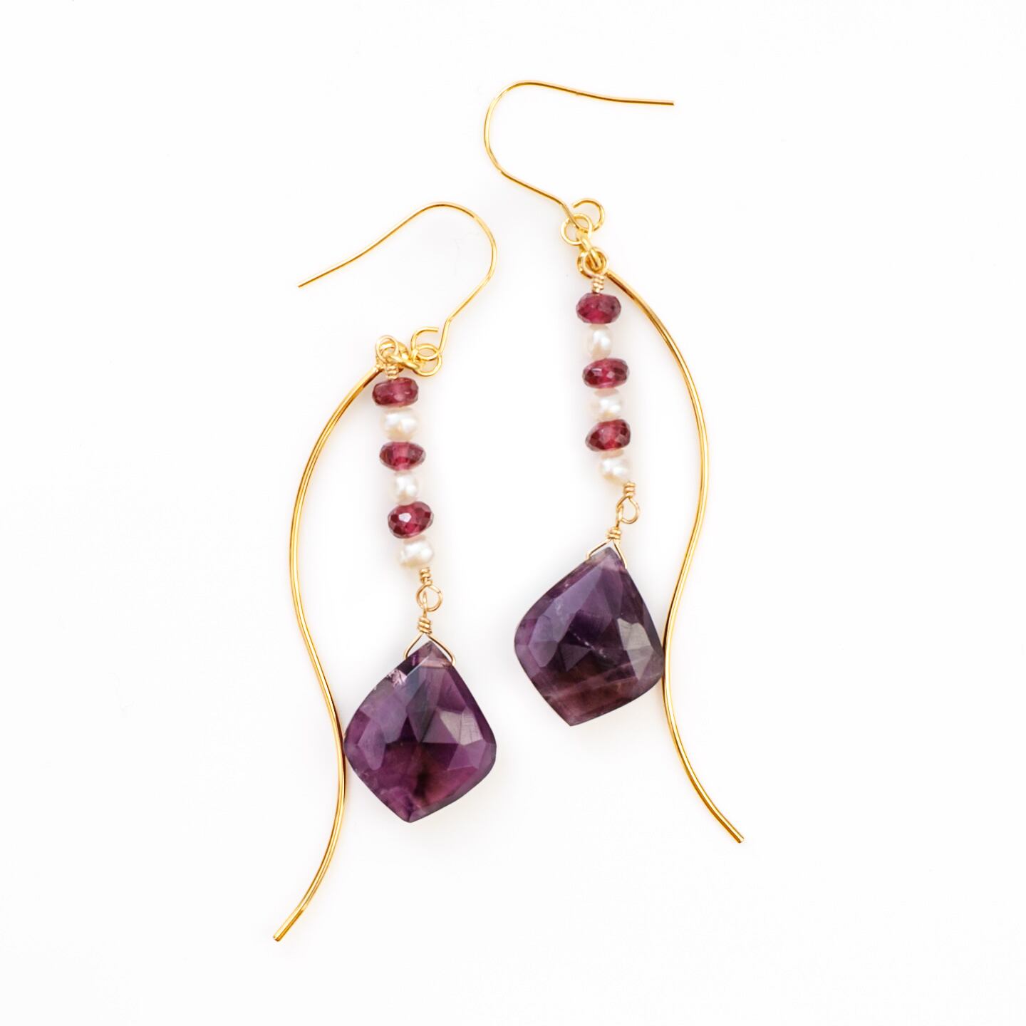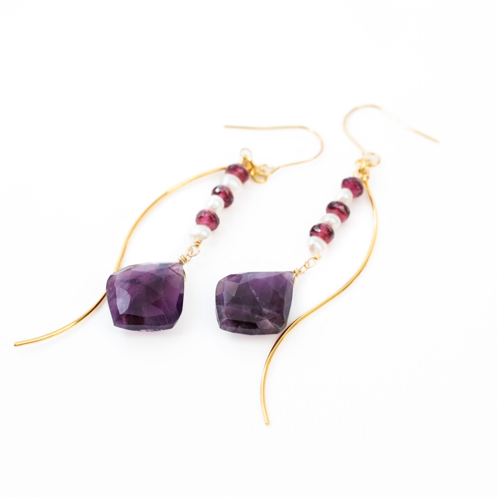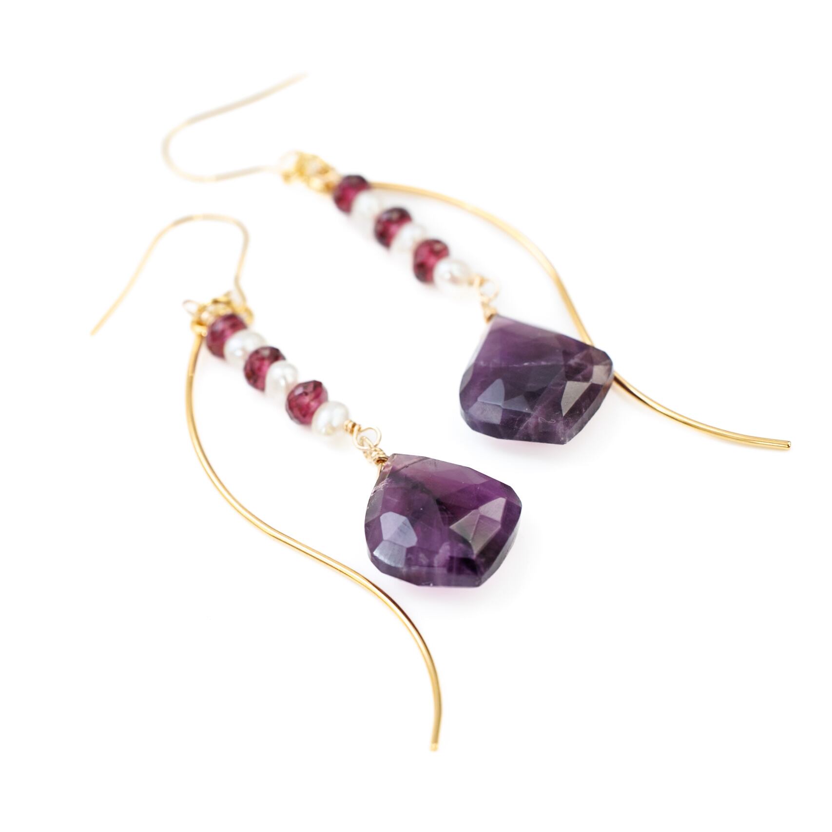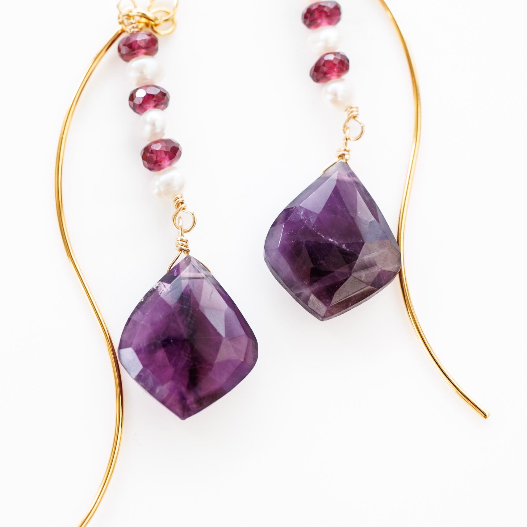 存在感のある紫色のアメシストを主役に、淡水パールのホワイトと、深みのあるボルドー色のグレープガーネットを縦のラインに綴るように組み合わせたピアスです。