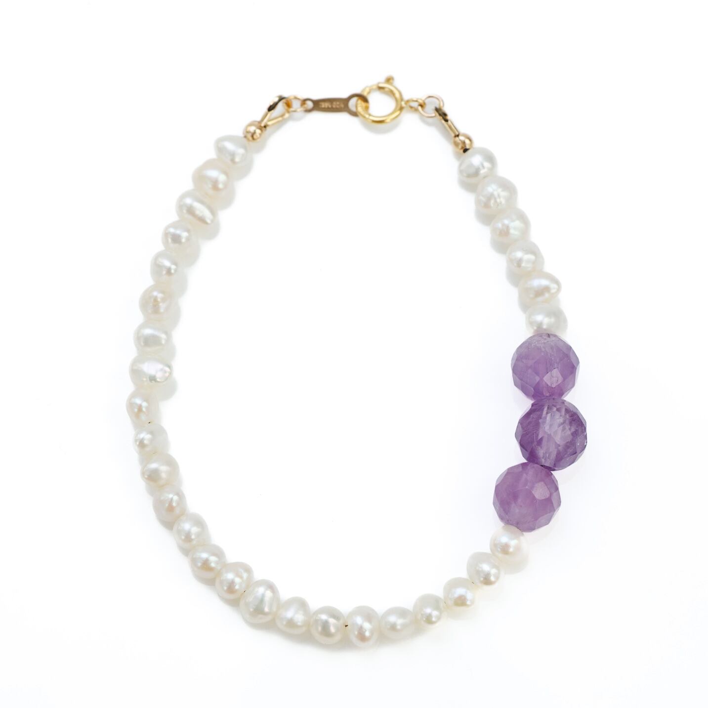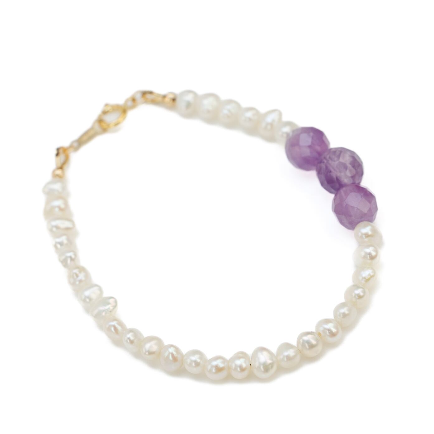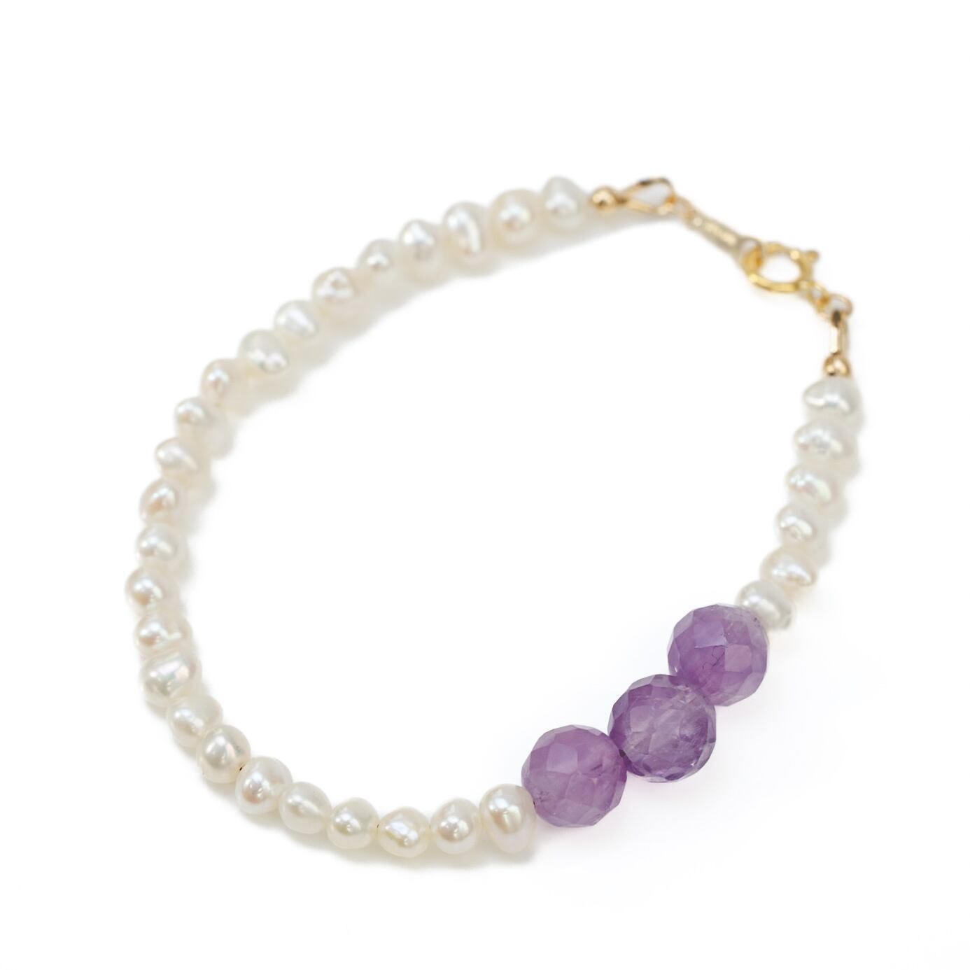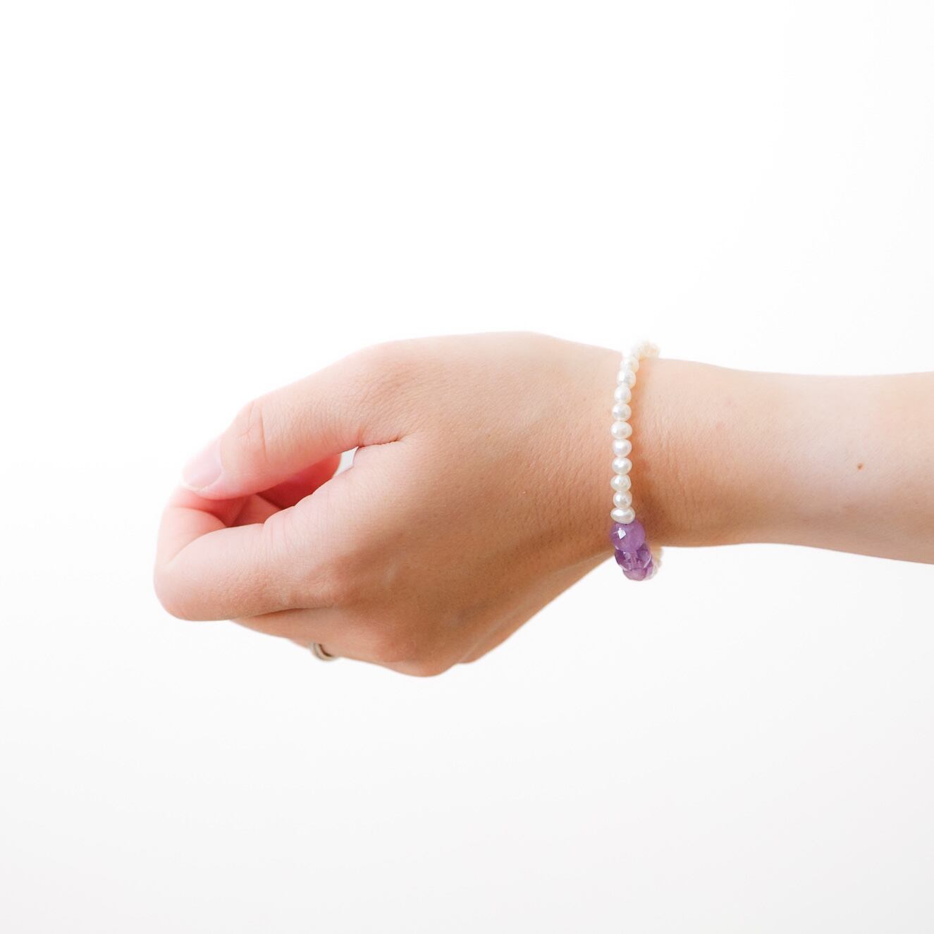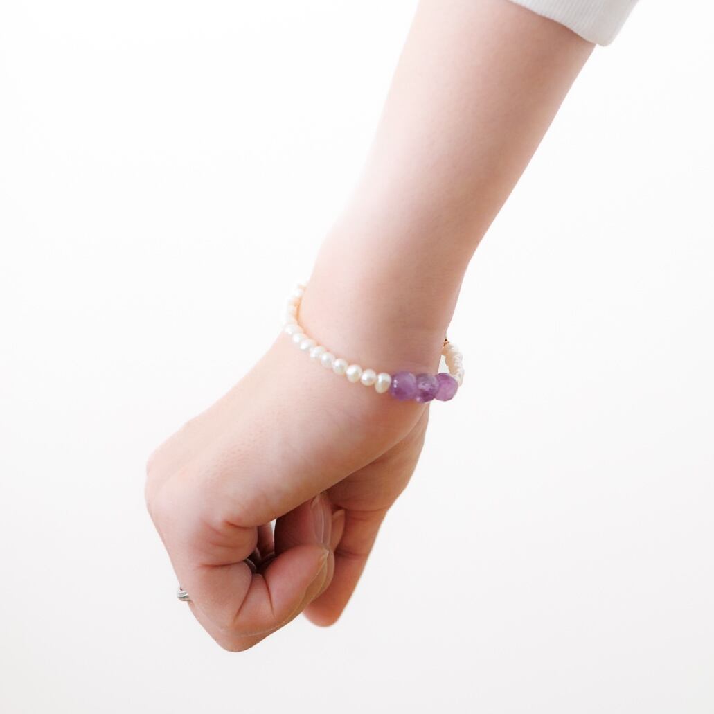 やわらかなホワイトカラーの淡水パールに、紫の濃淡が美しいアメシストを3粒だけ添えたブレスレットです。