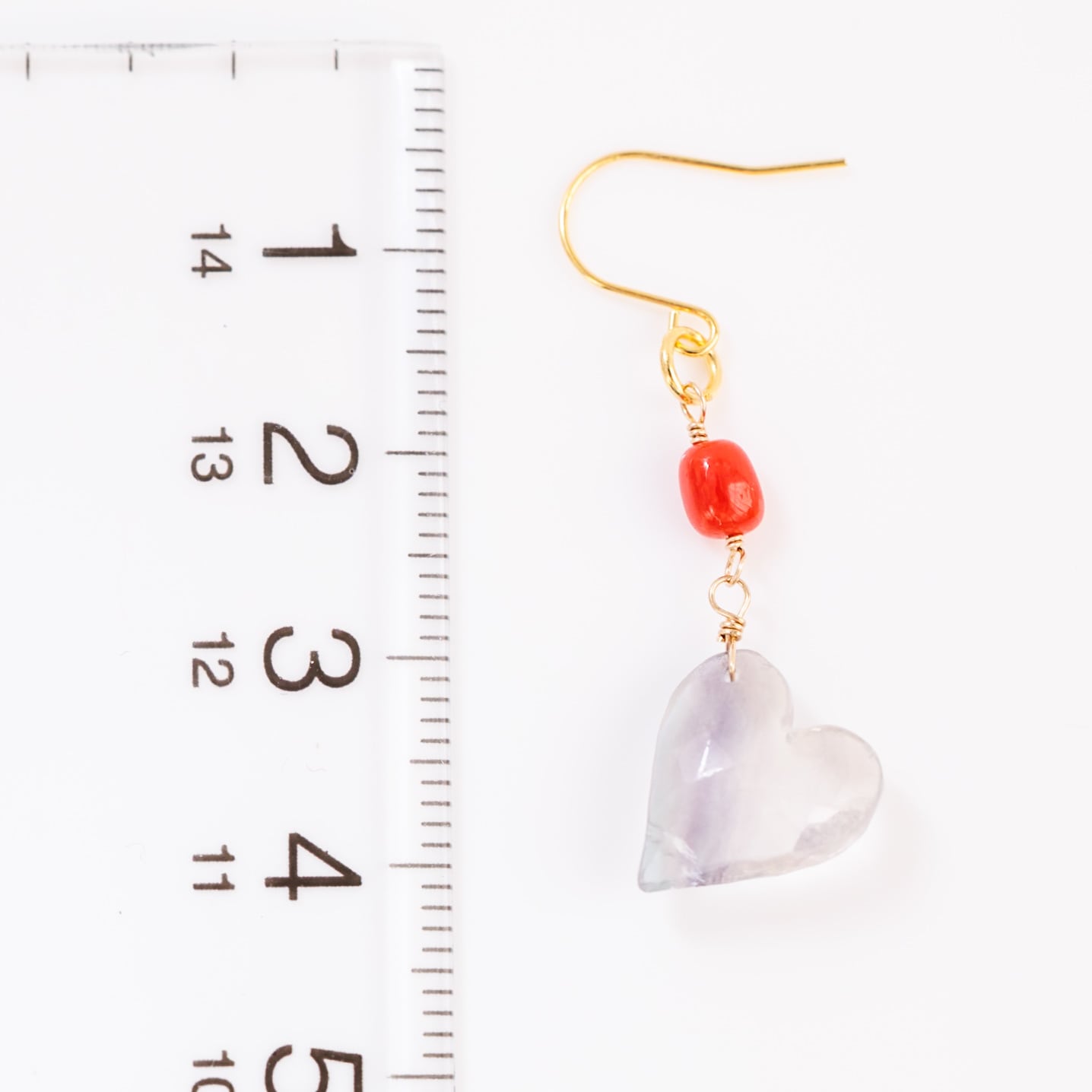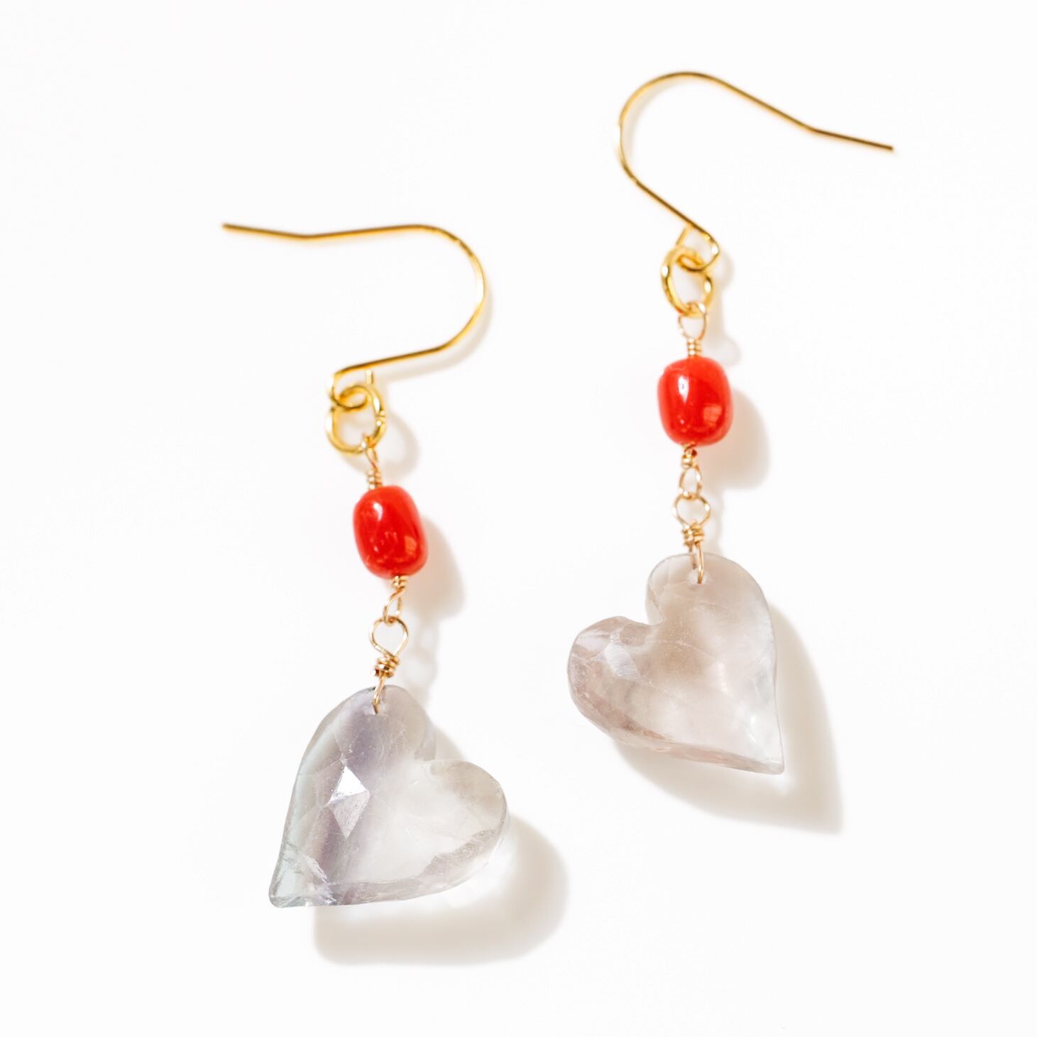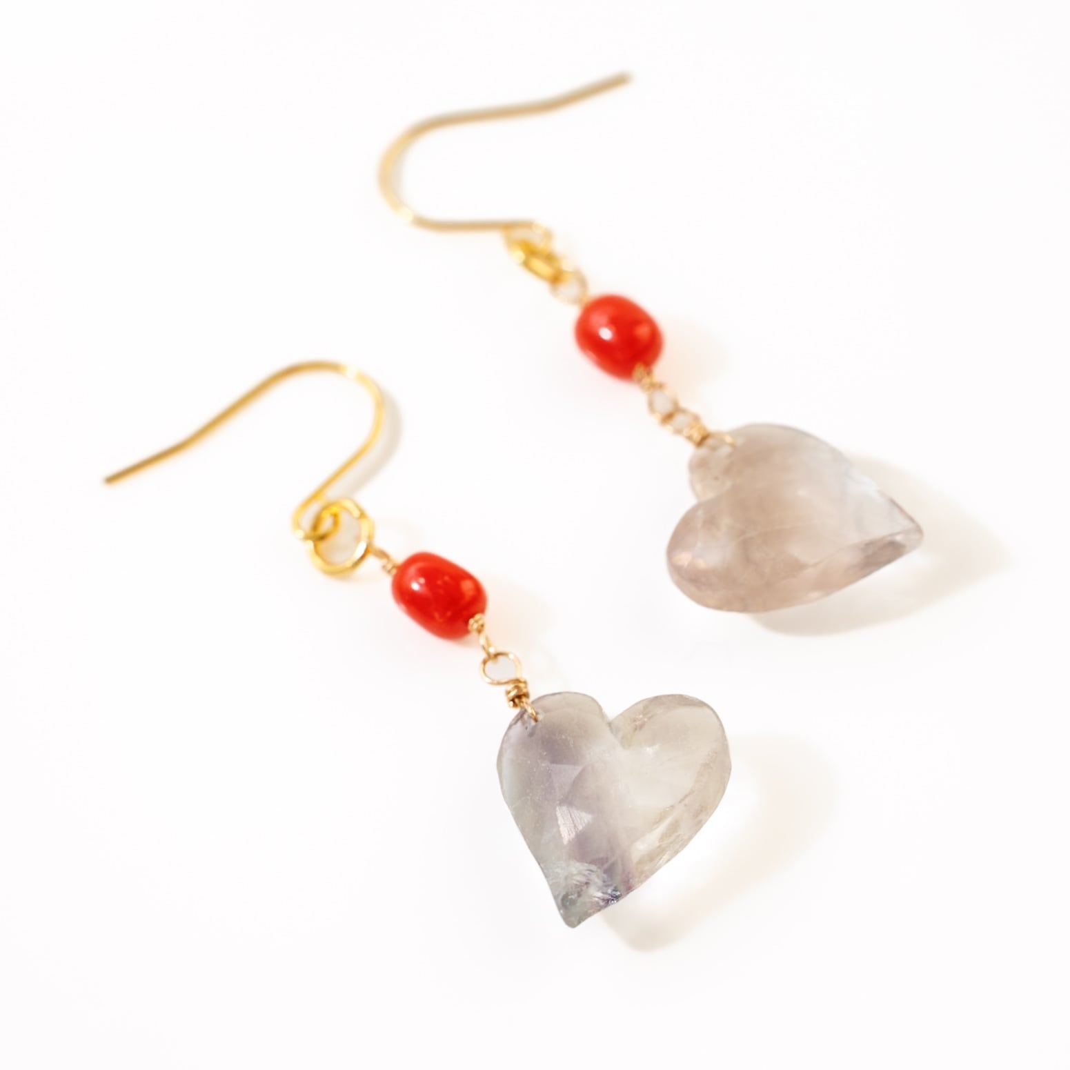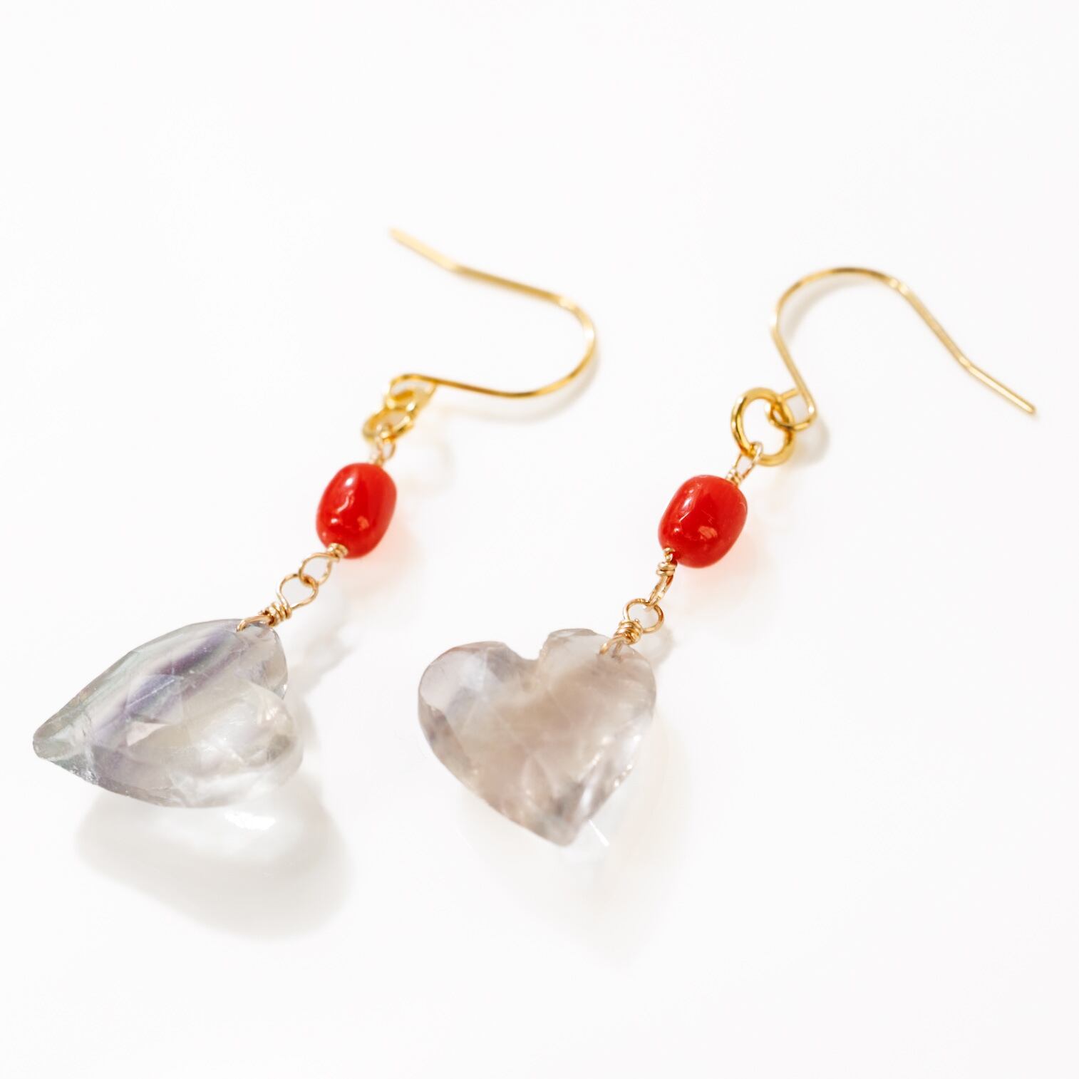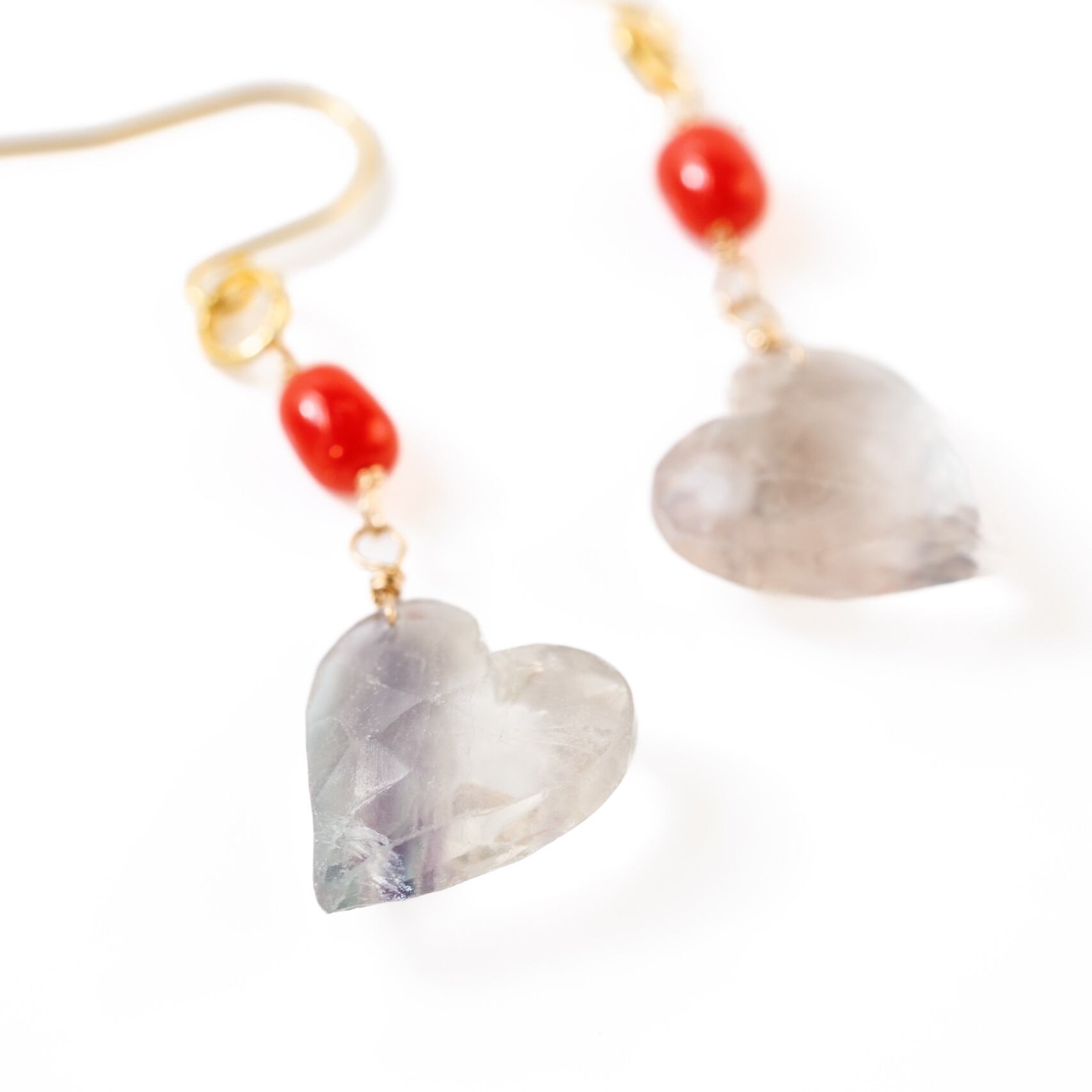 淡いフローライトと血赤珊瑚のハートピアス やわらかさと深紅のコントラスト