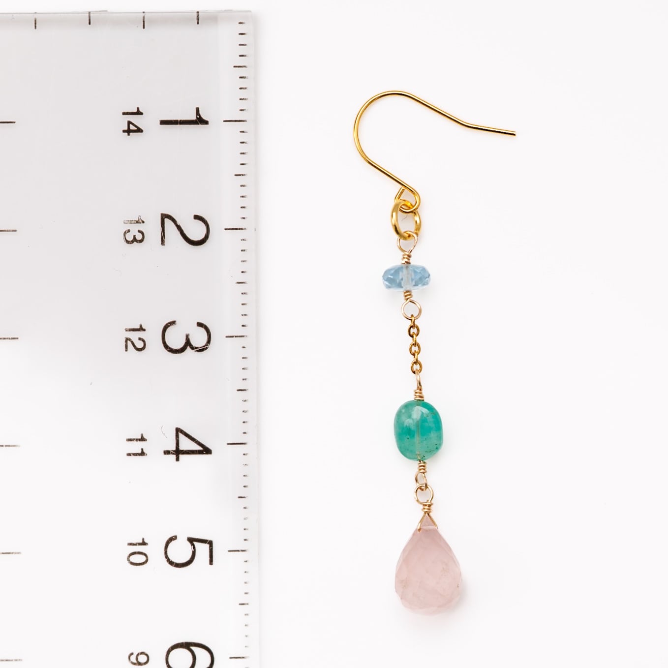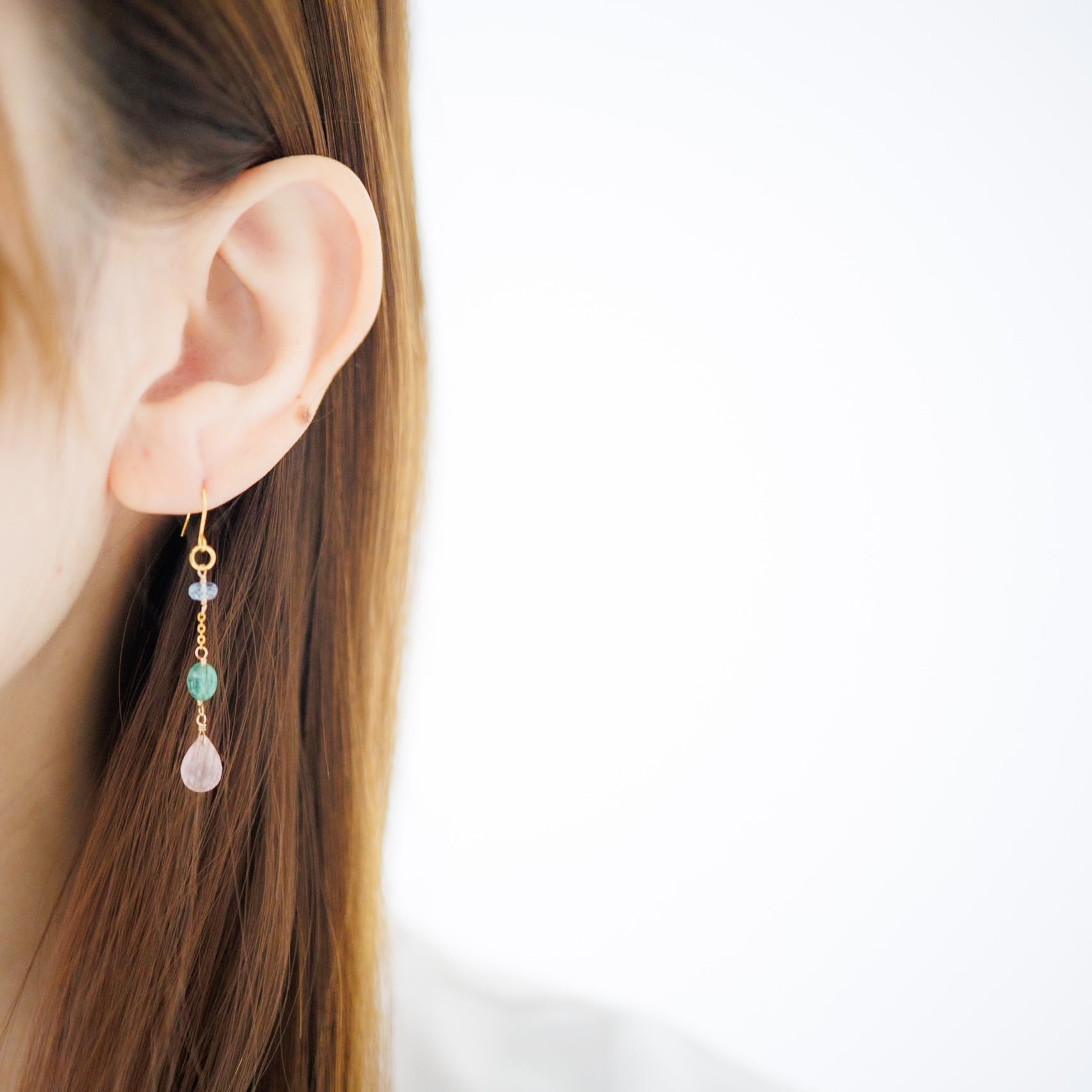 同じベリルの仲間でも、それぞれ異なる色と表情をもつ天然石を、縦にすっとつなげた軽やかなピアスです。