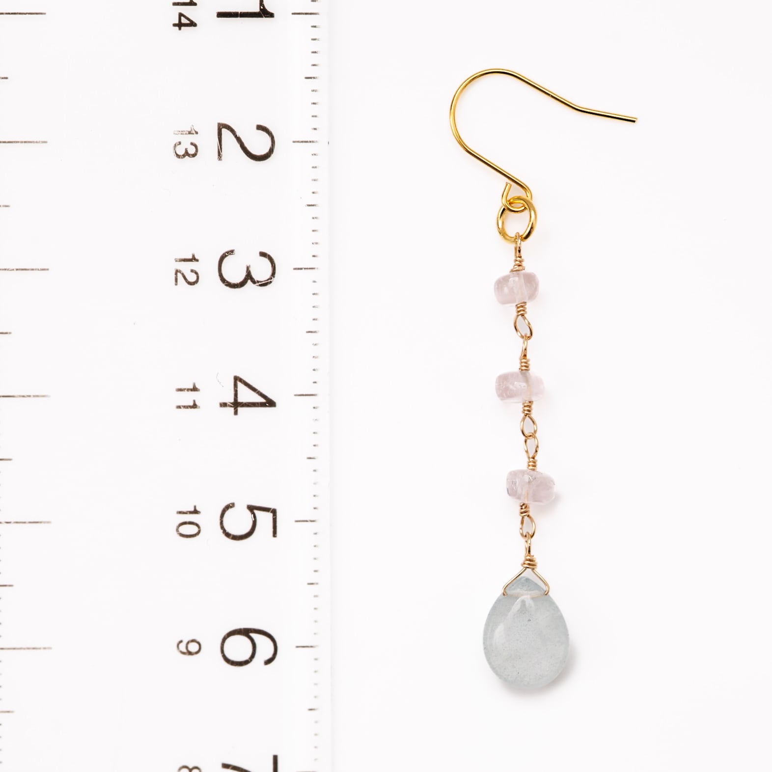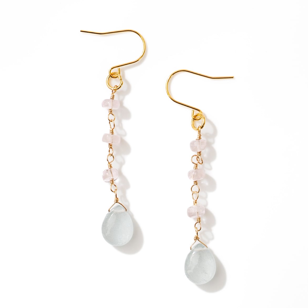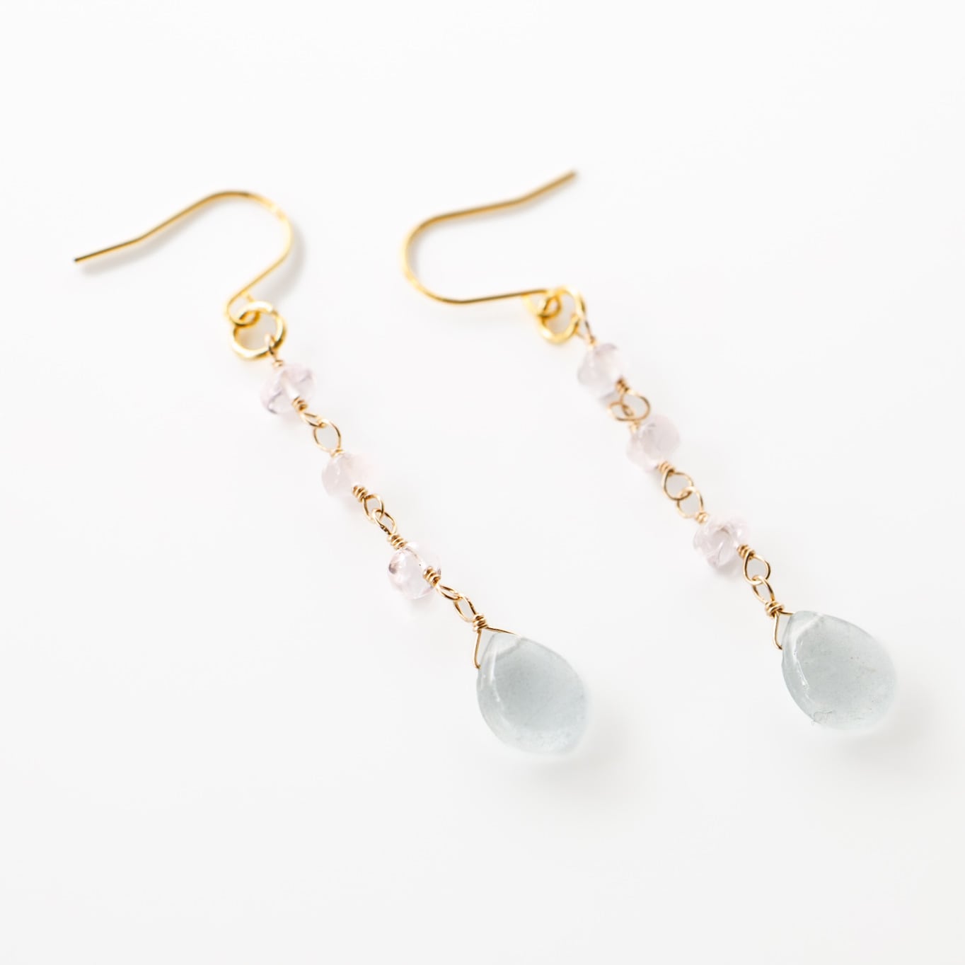 動くたびに揺れる天然石が、透明感のある水色と淡いピンクを重ね、軽やかな印象を与えます。