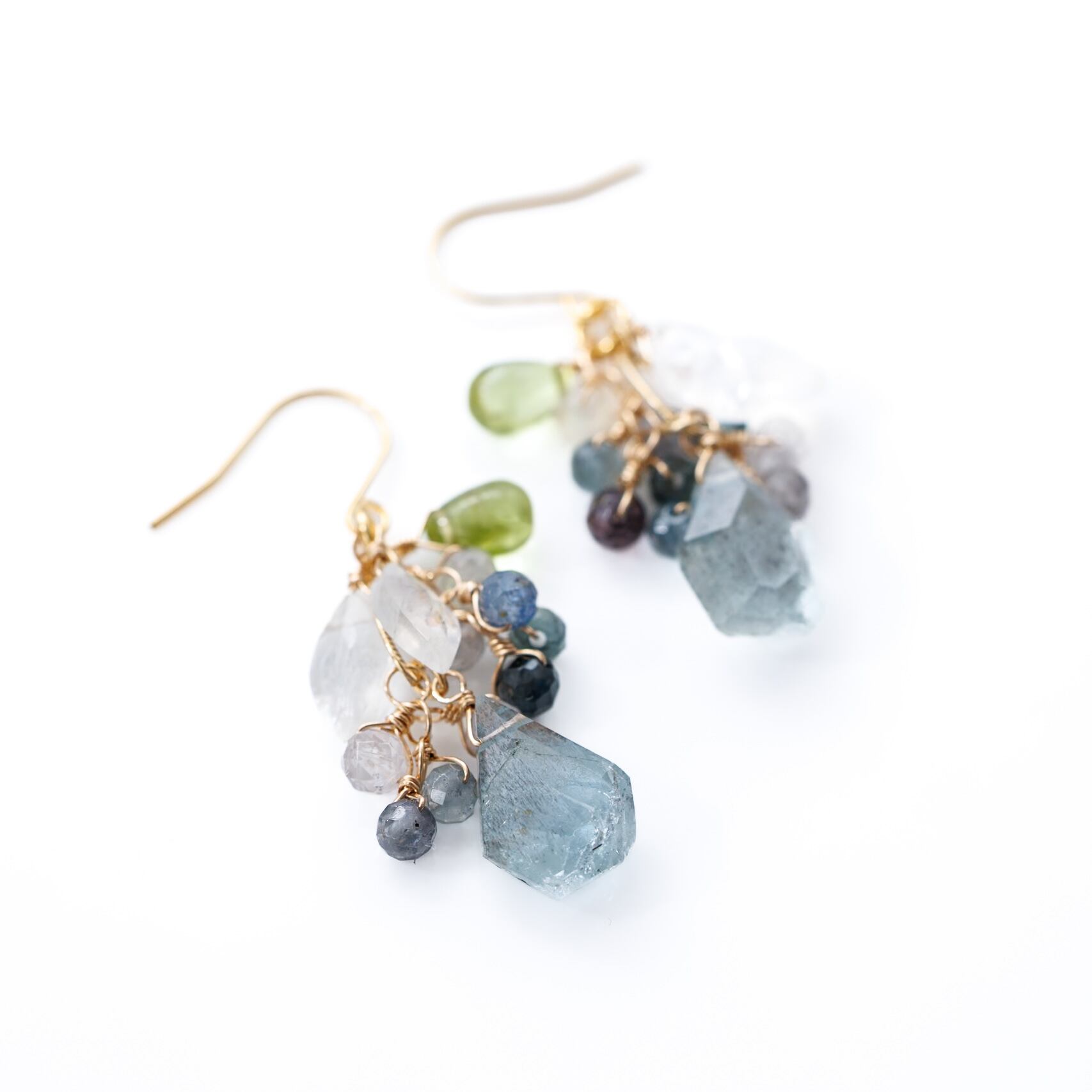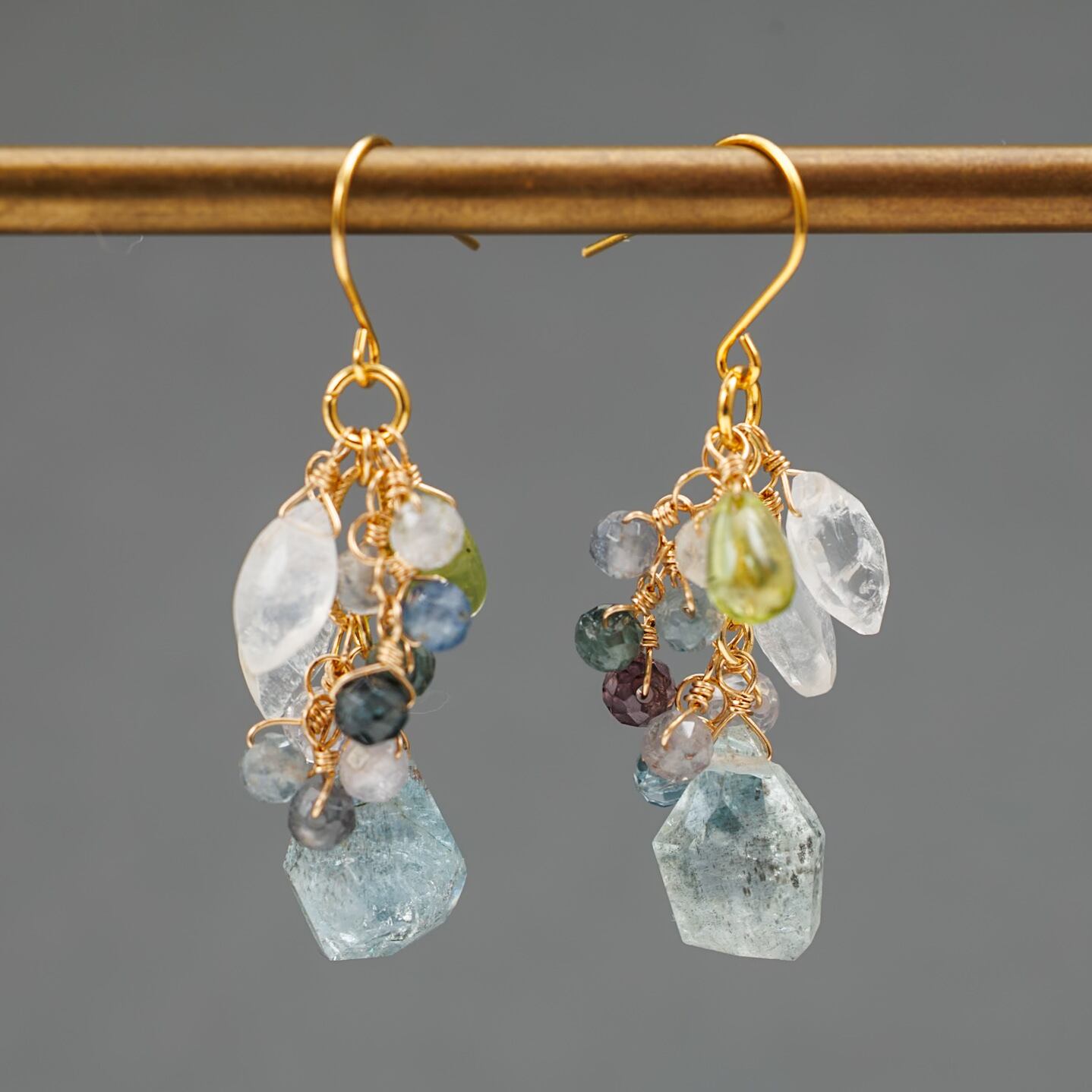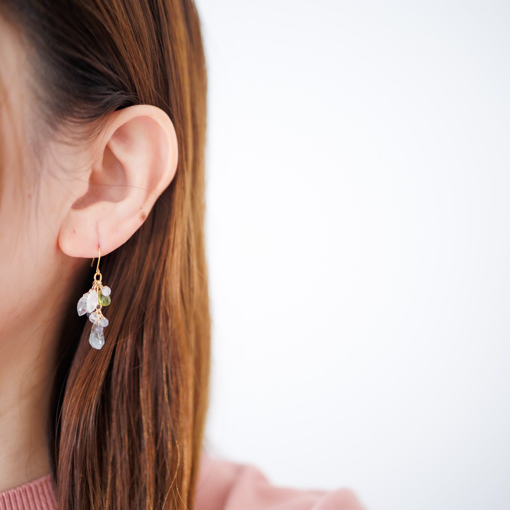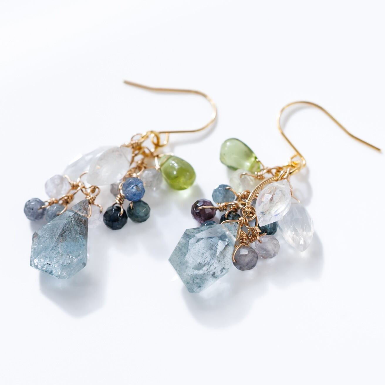 モスアクアマリン、ホワイトラブラドライト、ペリドット、スピネルを束ねた揺れる天然石ピアスです。