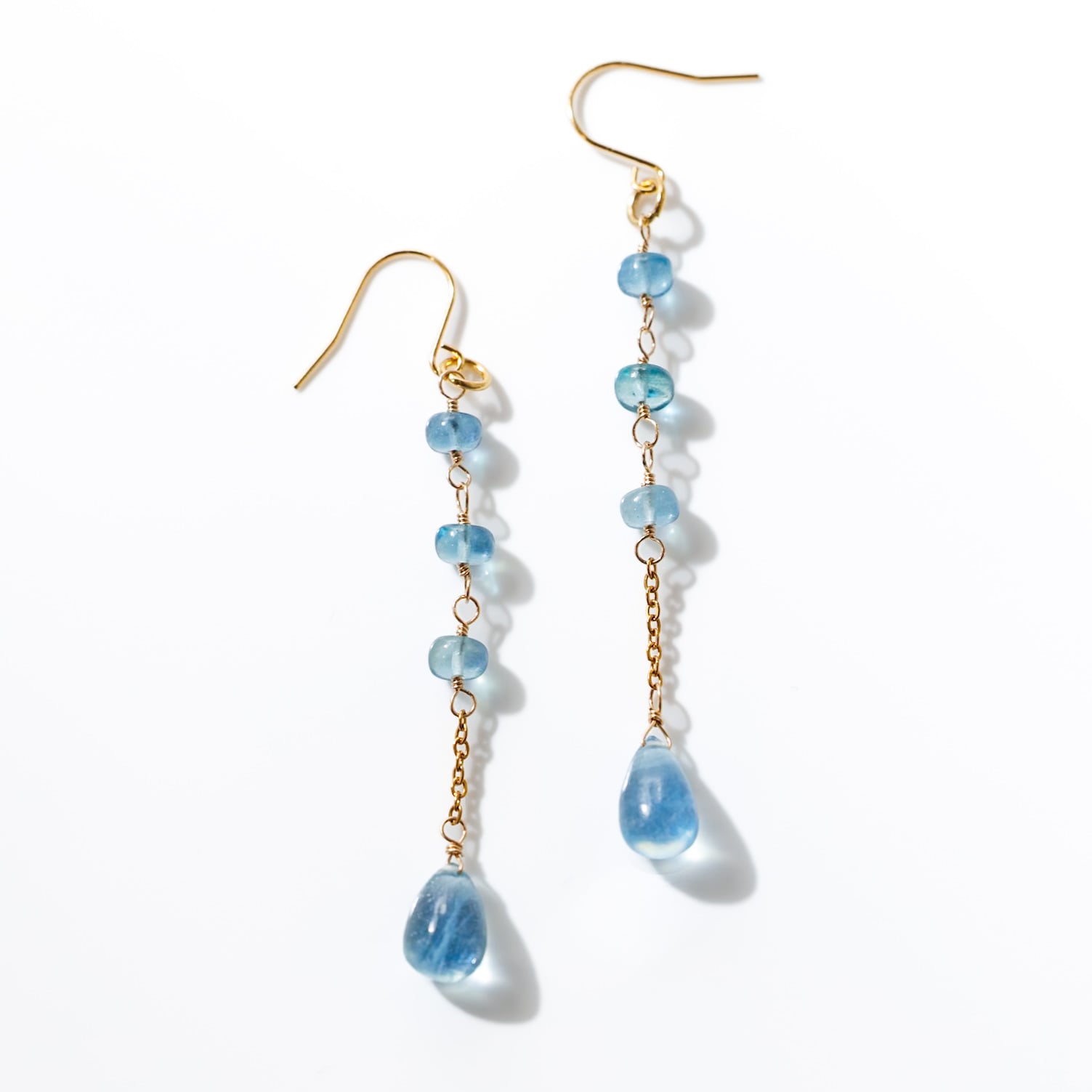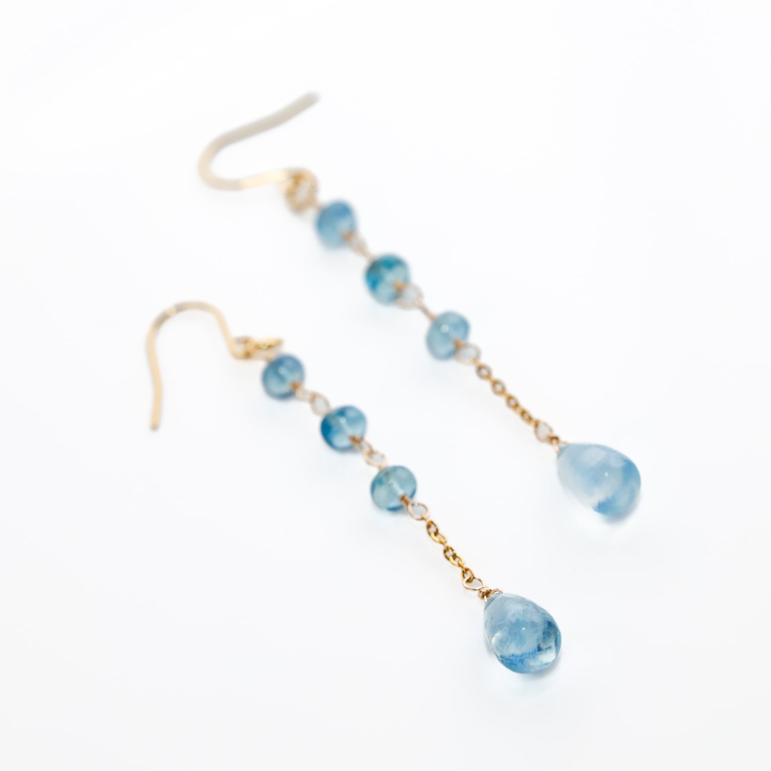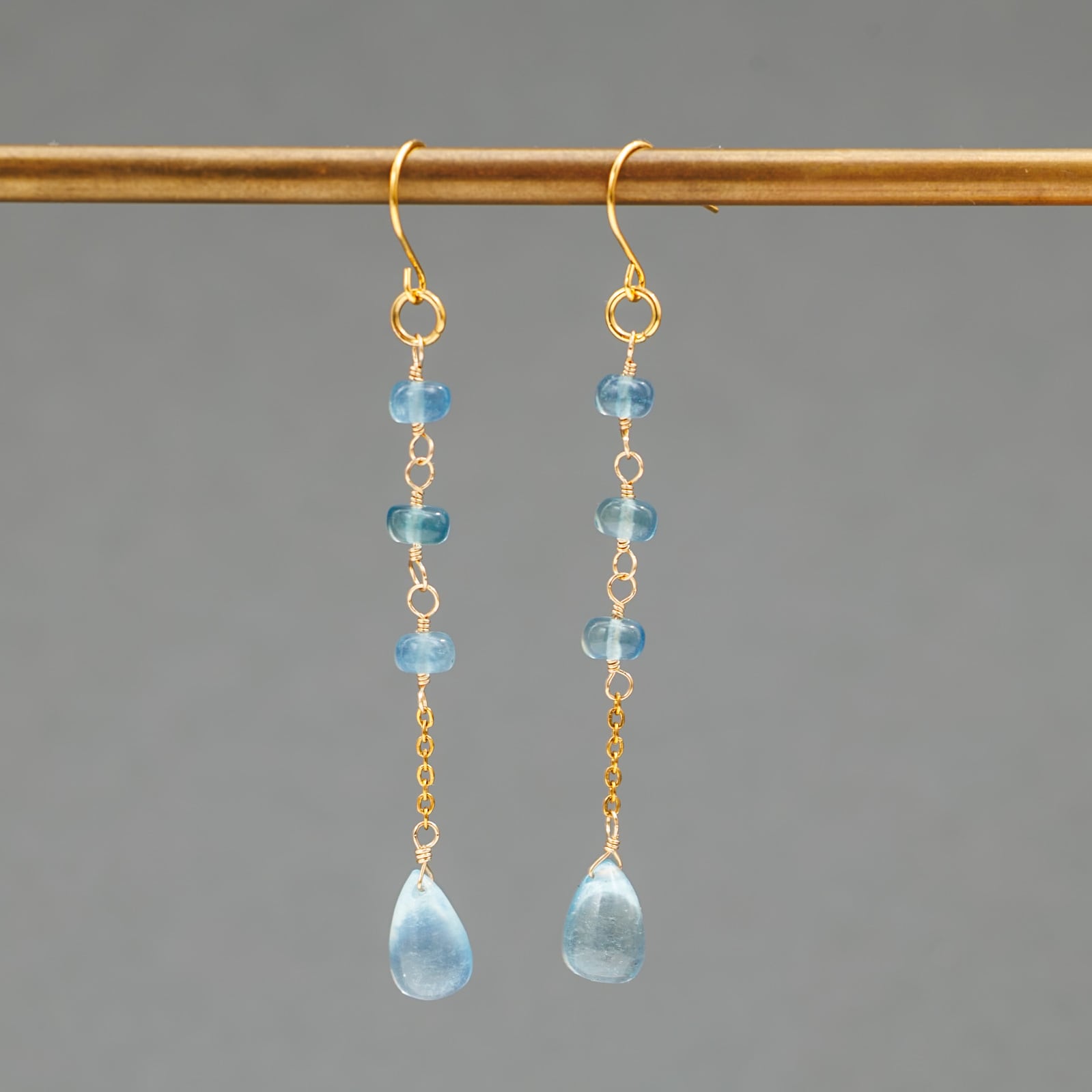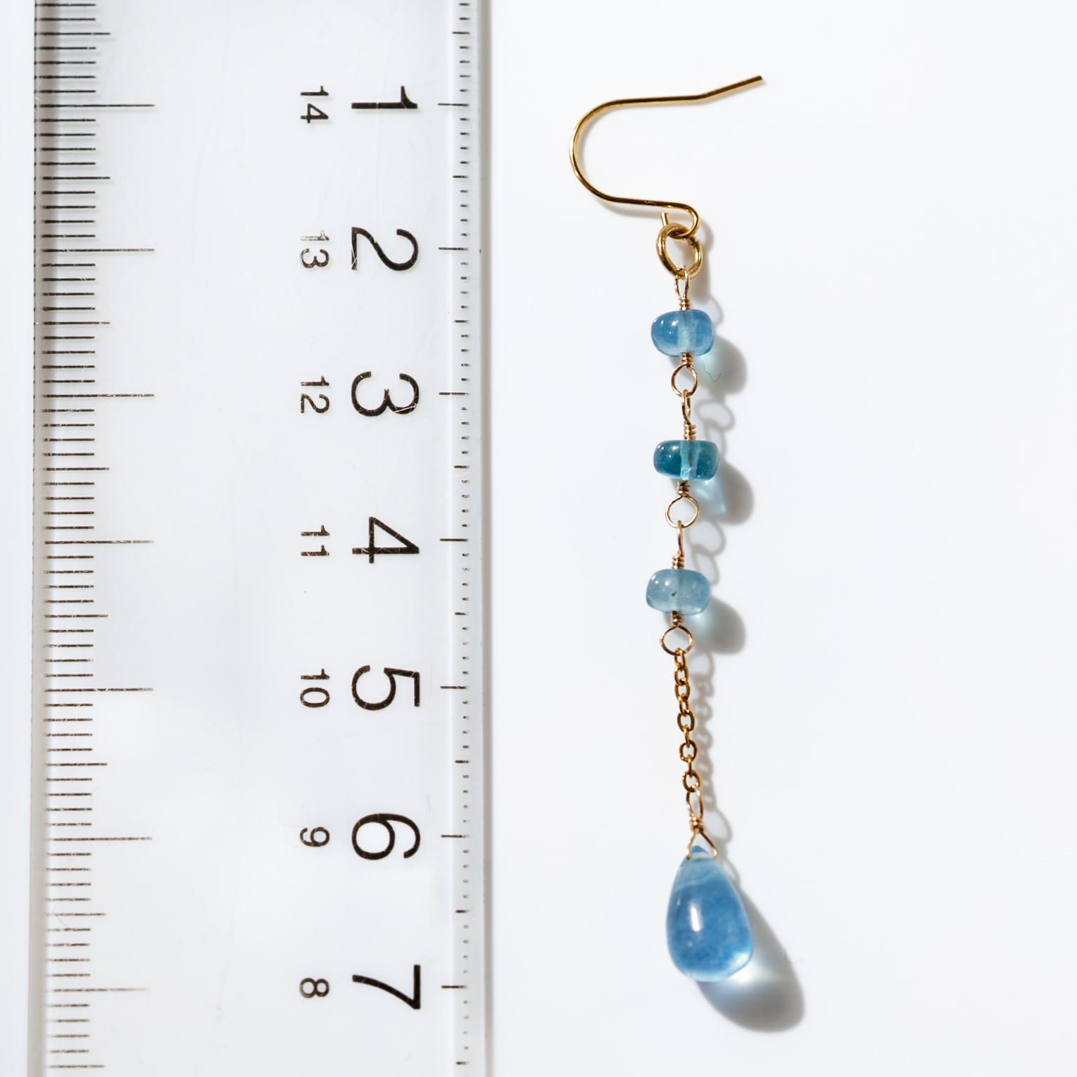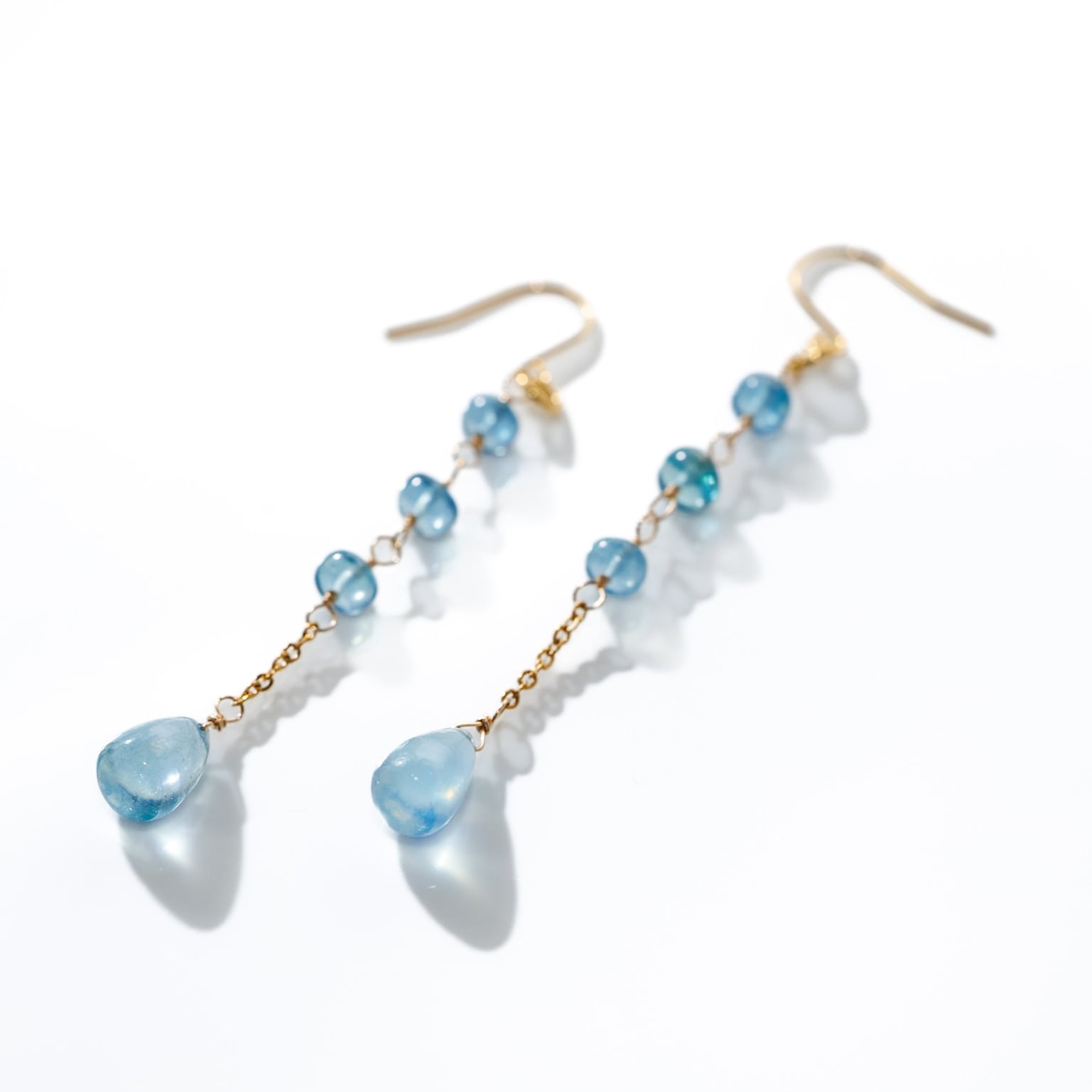 色の濃いアクアマリンを縦に連ねた揺れるデザインの天然石ピアスです。