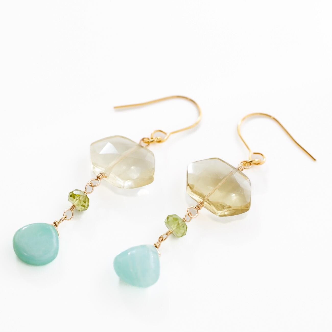 上部には淡いレモンカラーのレモンクォーツ、その下にフレッシュなペリドット、そしてやわらかなブルーが印象的なブルーオパールを合わせています。