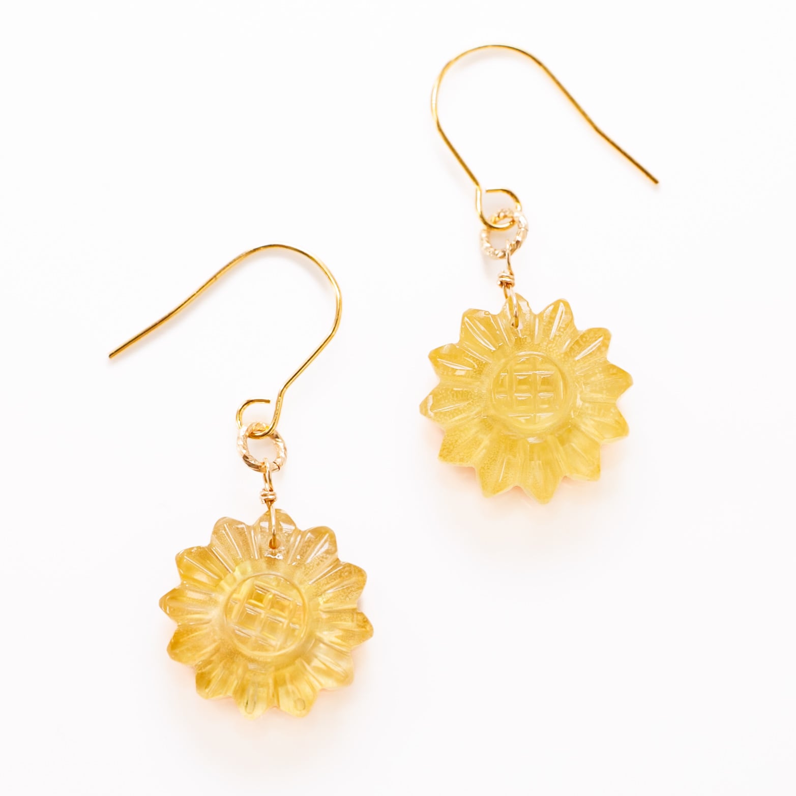明るい陽光にきらめく、可憐なレモンクォーツとシェルのひまわりピアス