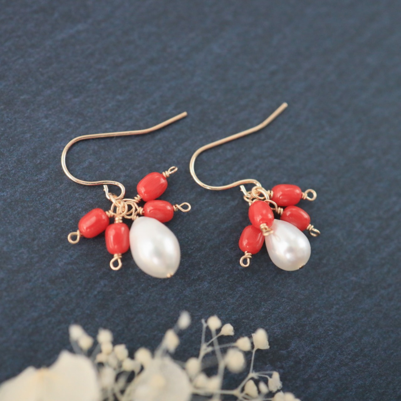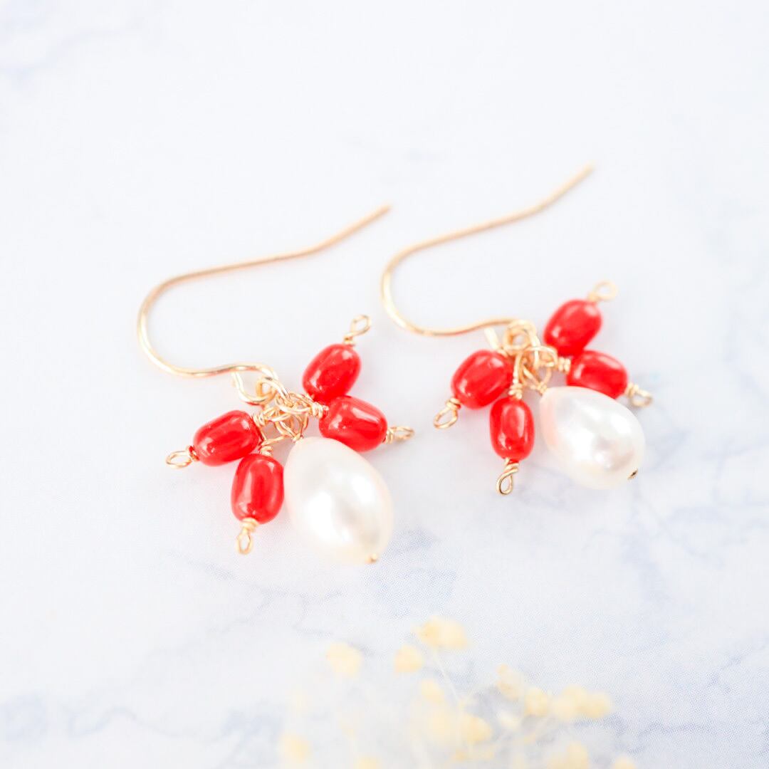 淡水パール、血赤珊瑚のピアス/イヤリング