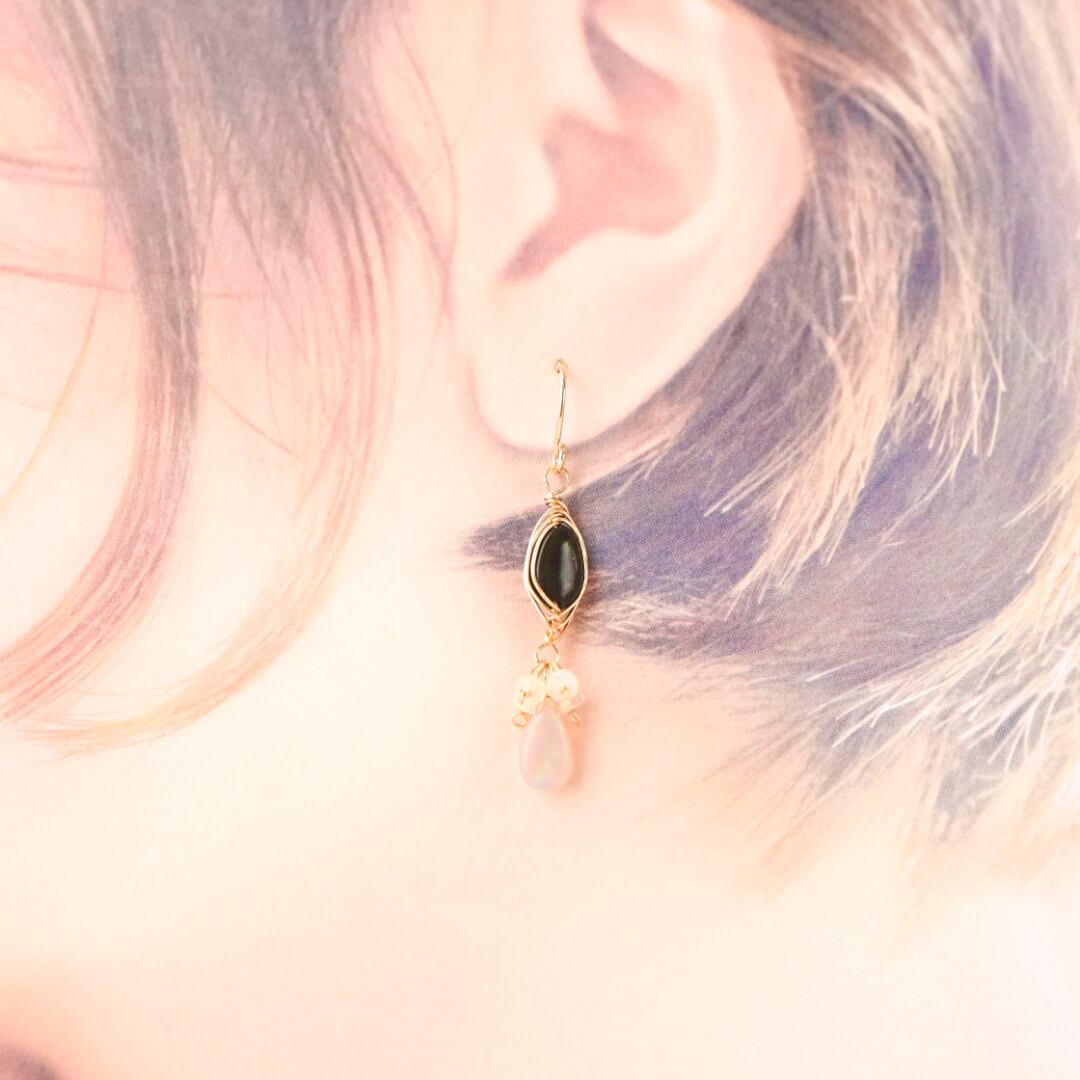 ブラックオパールをメインに、ピジョットオパールとプレシャスオパールのボタンカットをあしらったピアス/イヤリングです✧*。