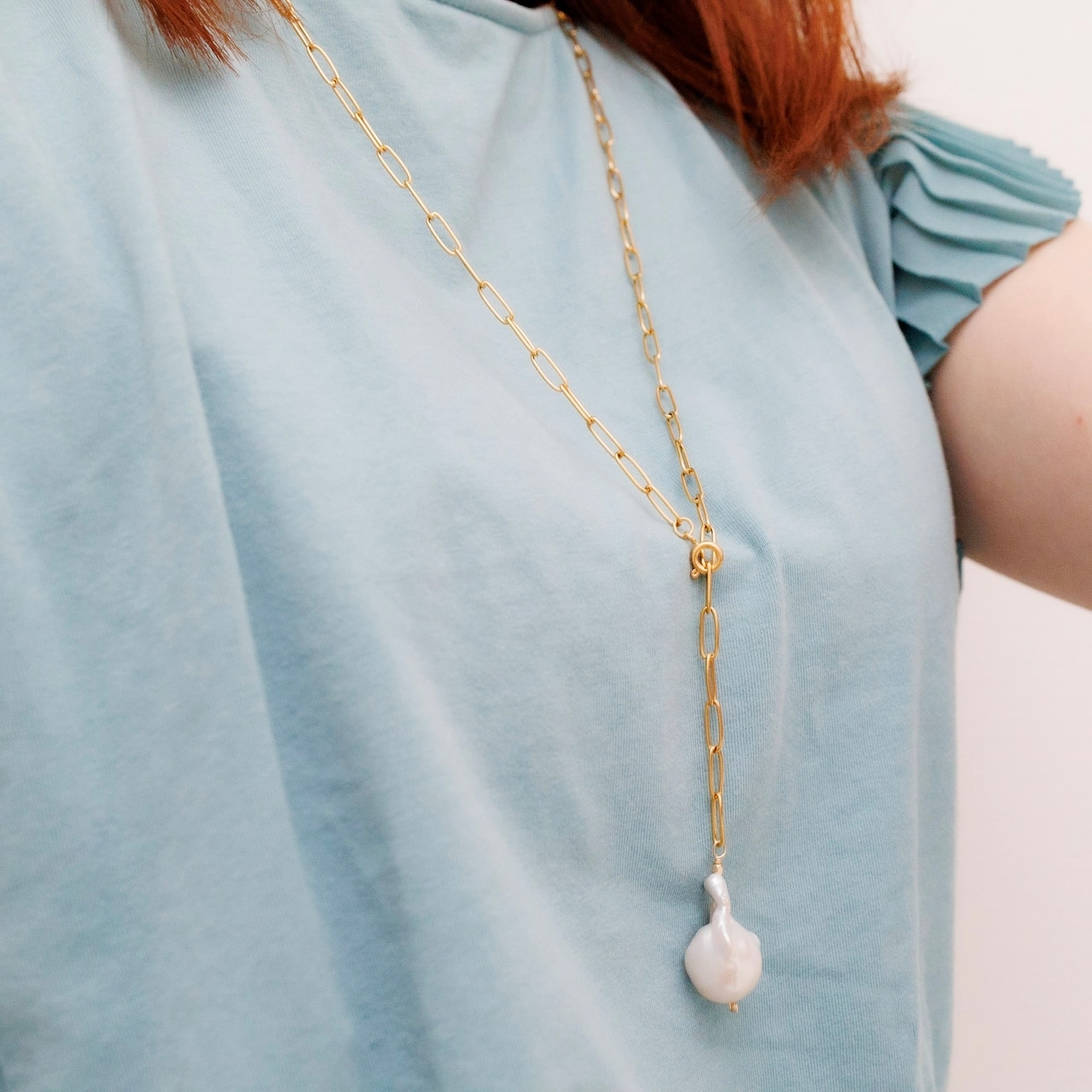 チェーンの金具は前に来るのでつける長さの調節もできますし、着脱が簡単で不器用な方も安心して身につける事ができます。