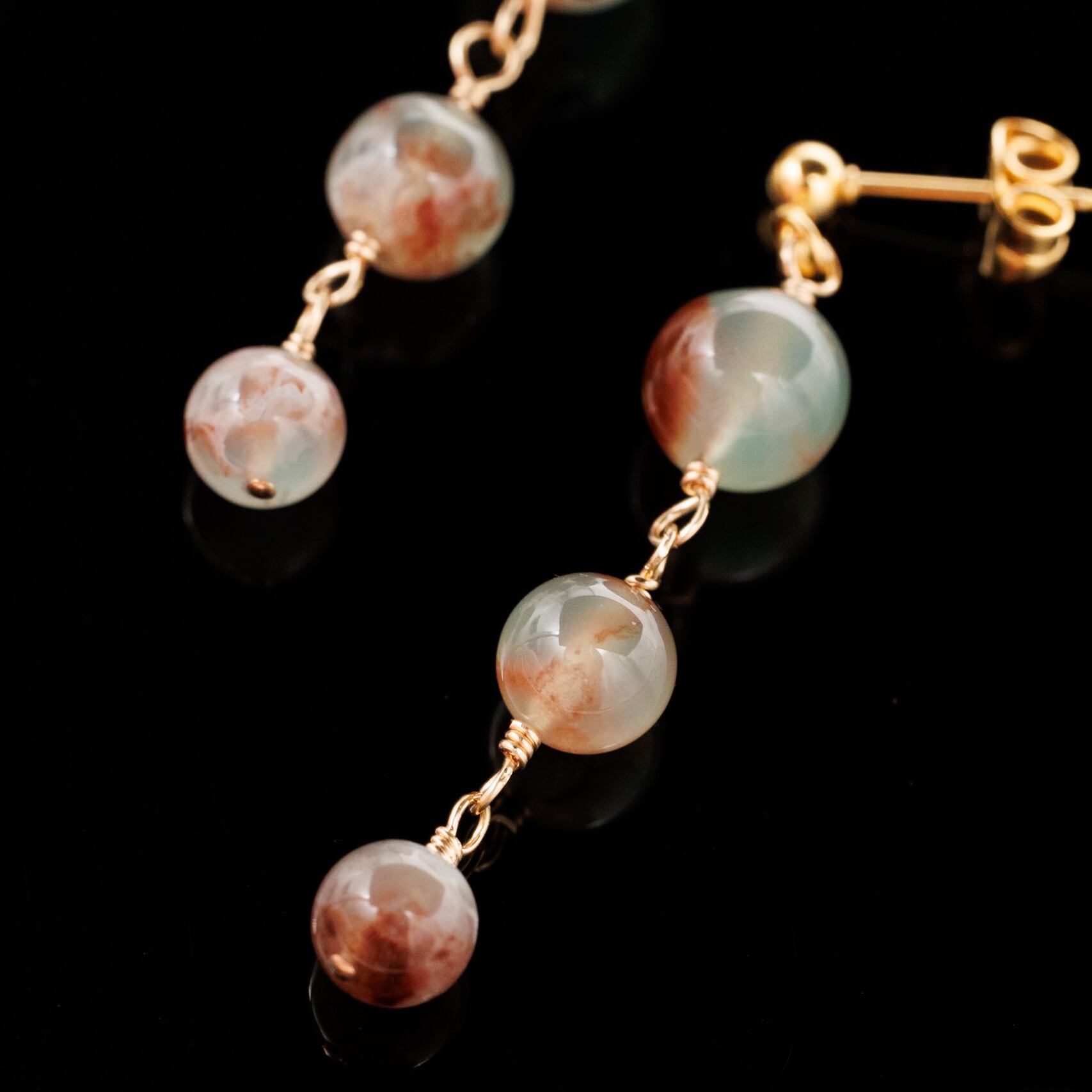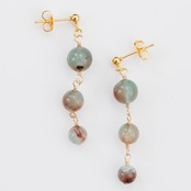 このピアスは、アクアプレーズ特有の優しいグリーンと、自然が発生する茶色い部分が絶妙に興味深い天然石ならではの一つ一つ異なる模様が、世界に一つだけの個性をあなたの耳元にお届けします。